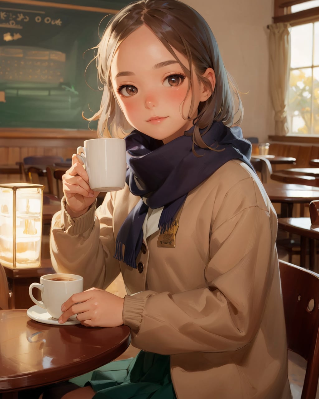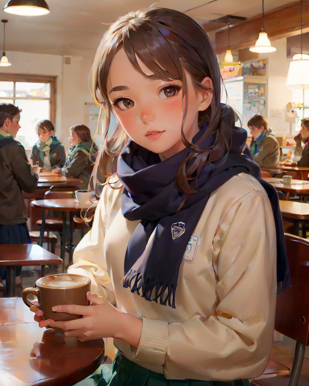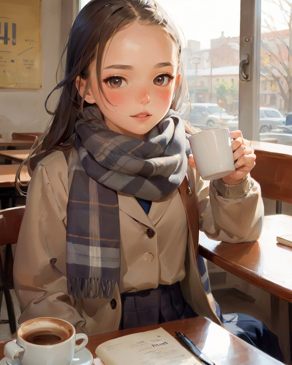 女子高生、ソロフォーカス、制服、スカーフ、マグカップ、ホットコーヒー、カフェ