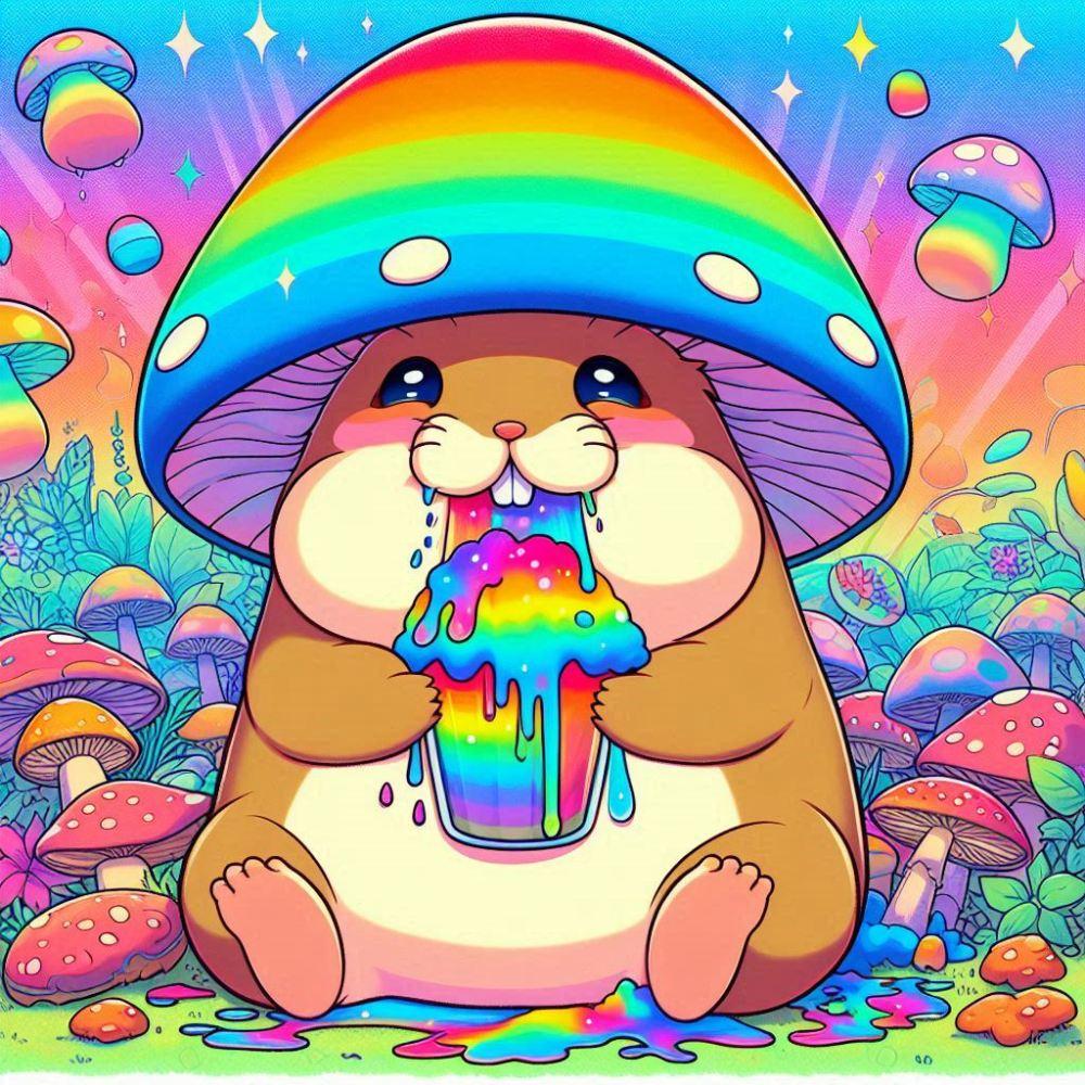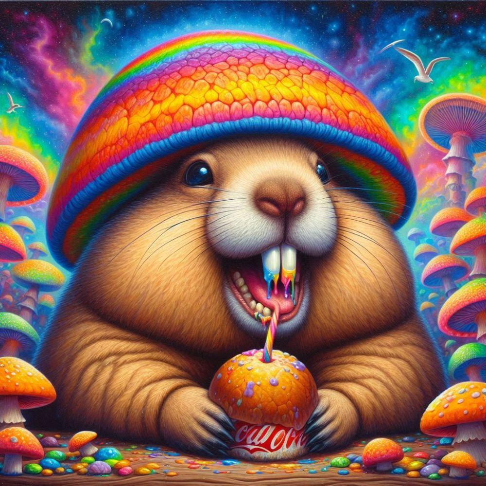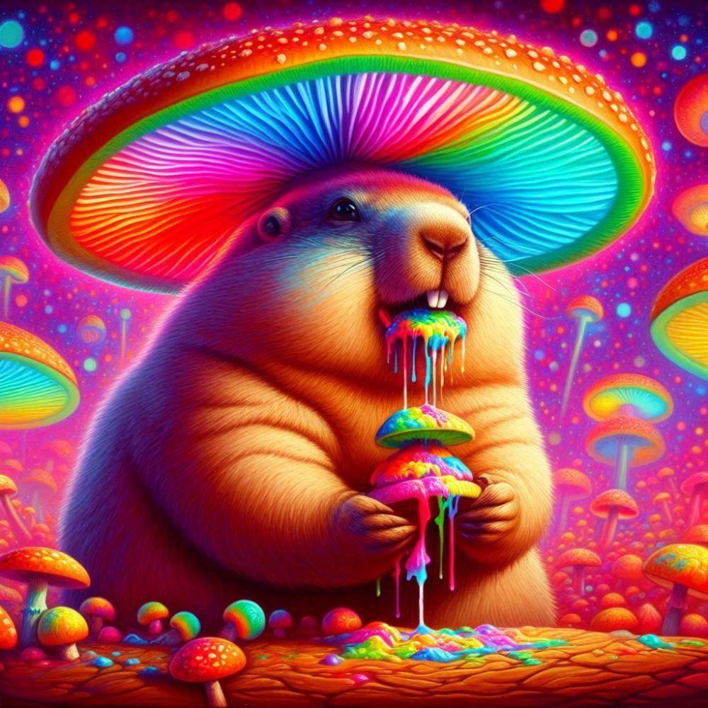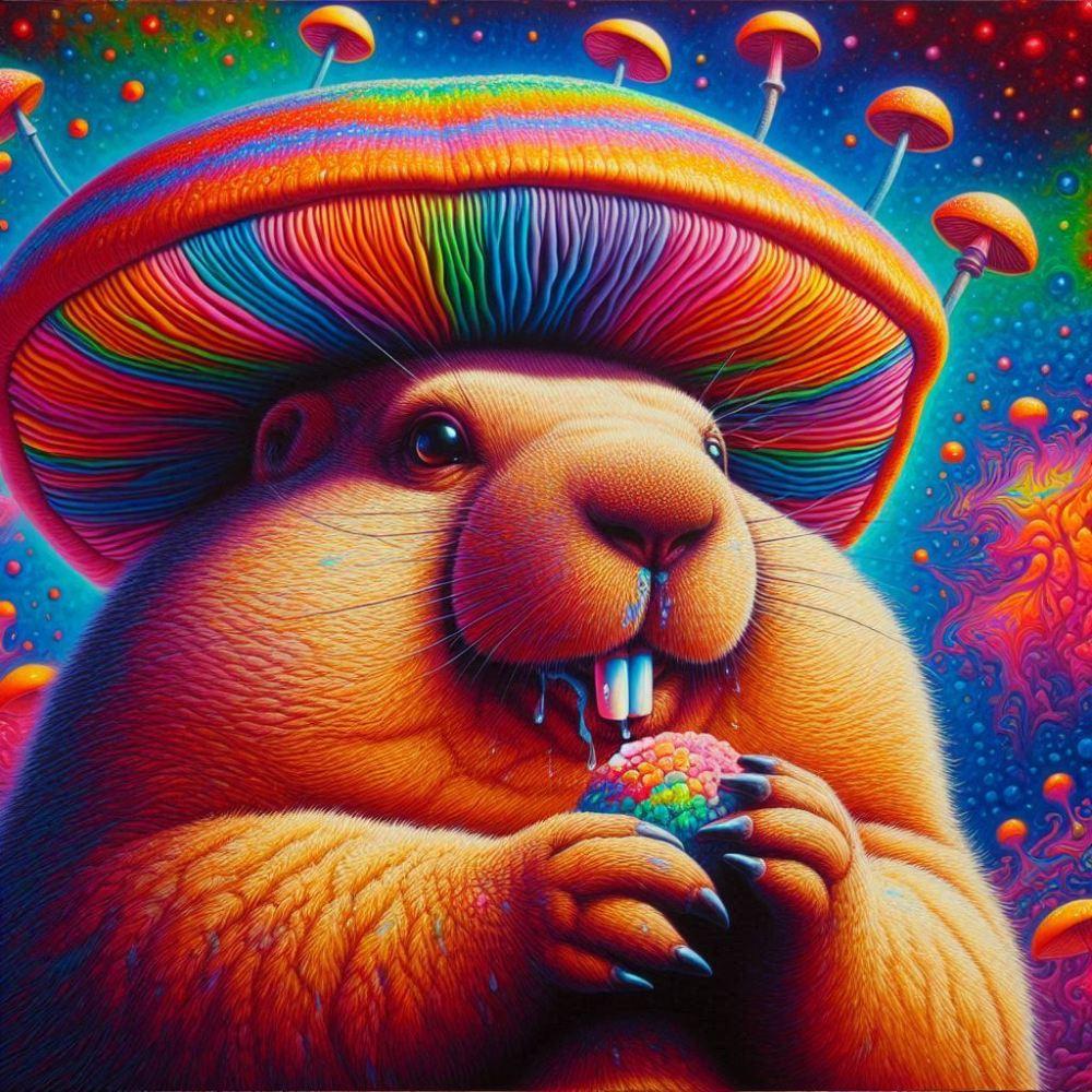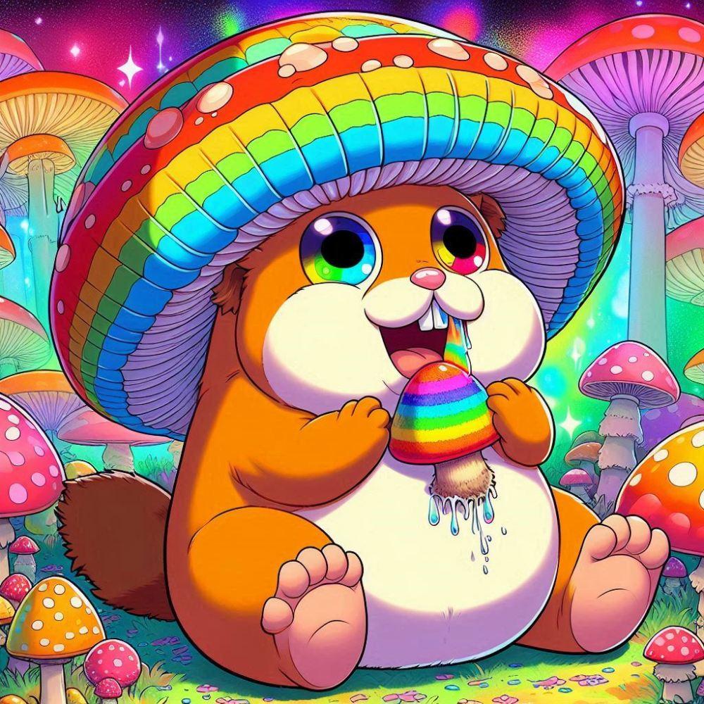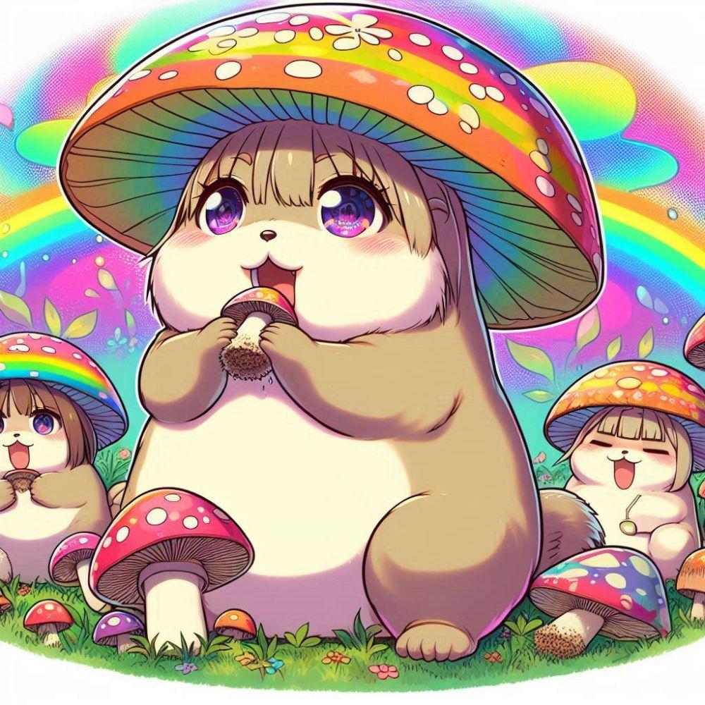 油絵アニメ風、発光きのこ食べるマーモット