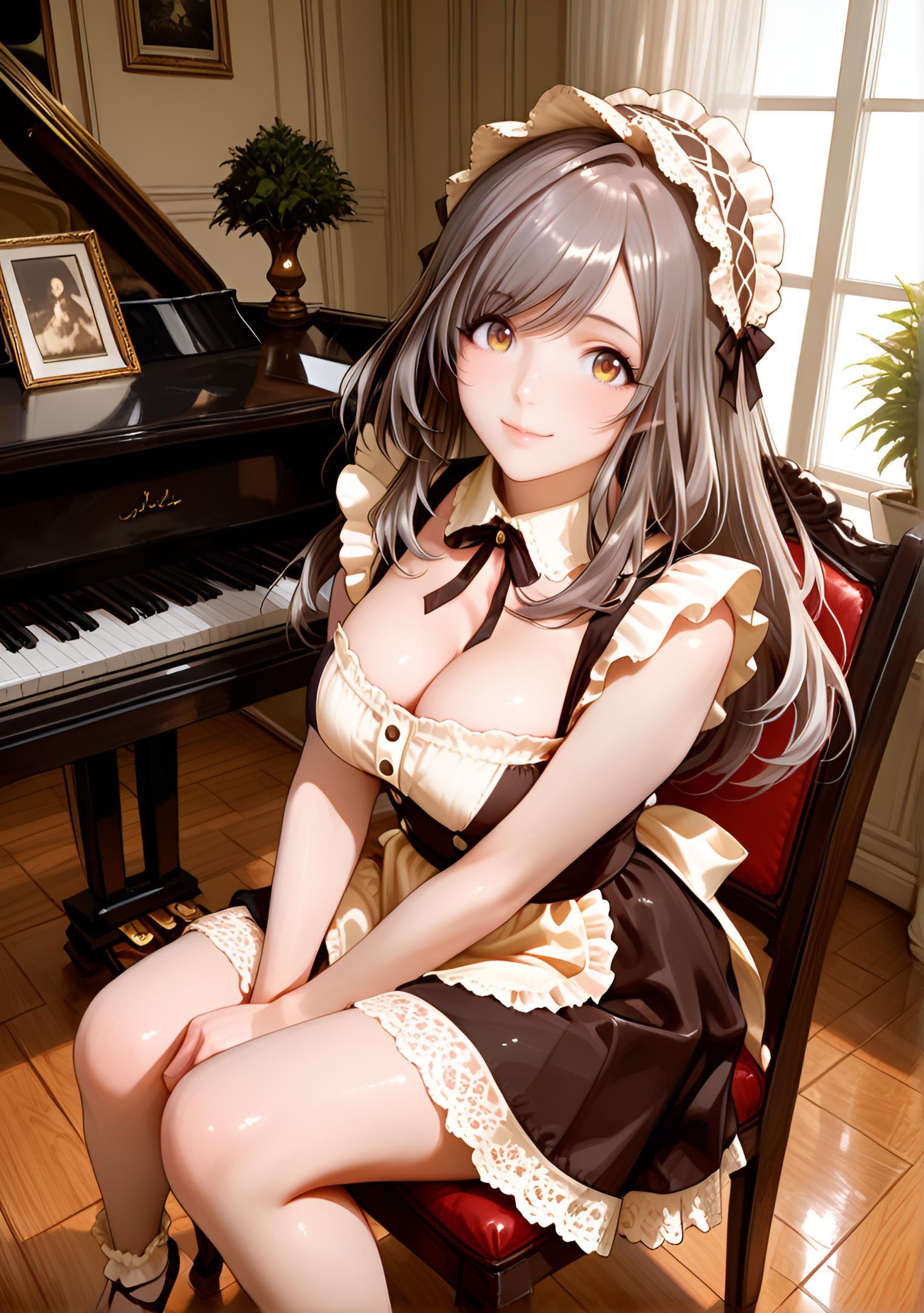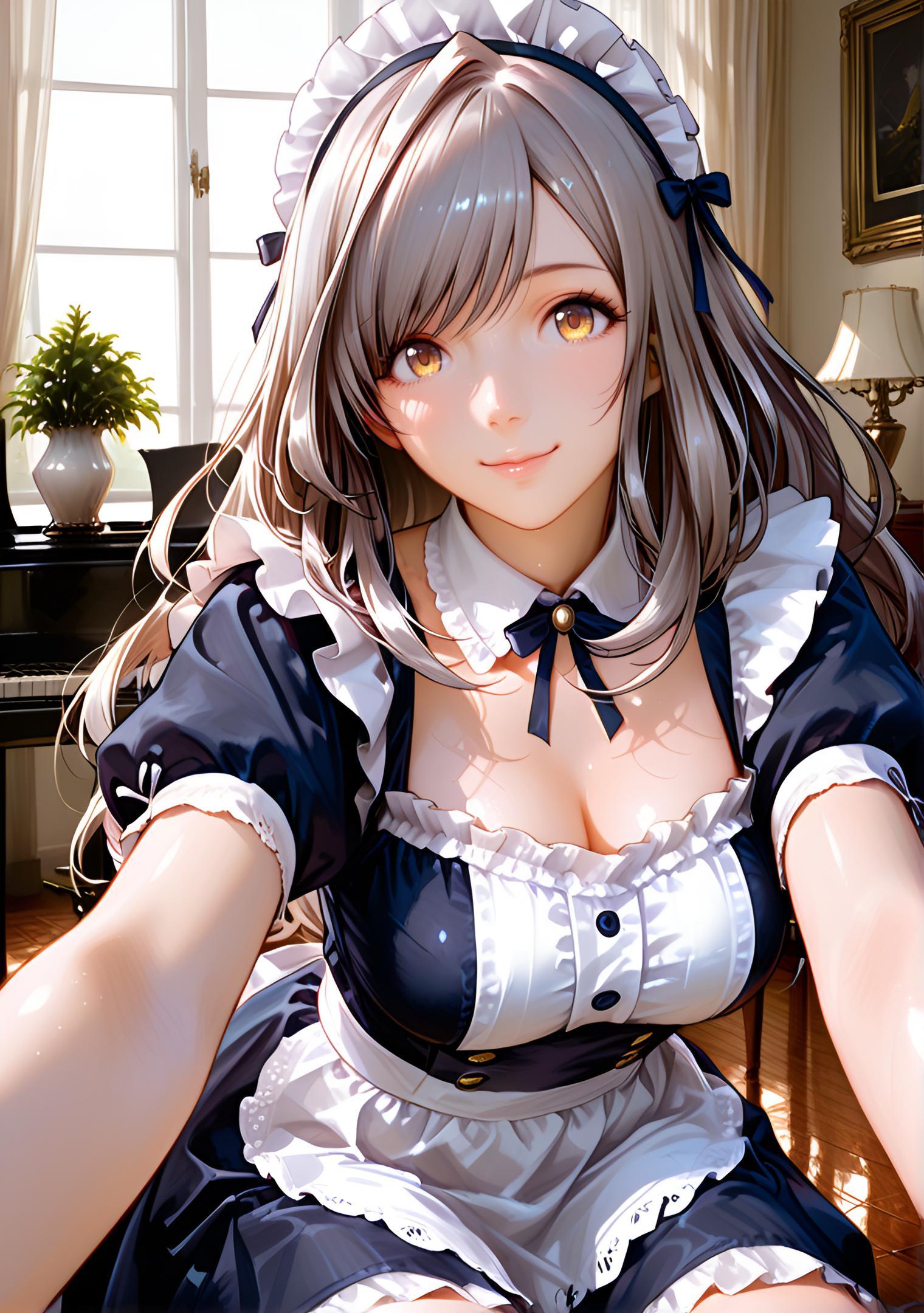 - soft cream-colored maid uniform with pastel peach undertones, satin finish, flared skirt with layered lace, pearl earrings, rose-shaped hair accessory # クリームピーチフェミニンメイド
