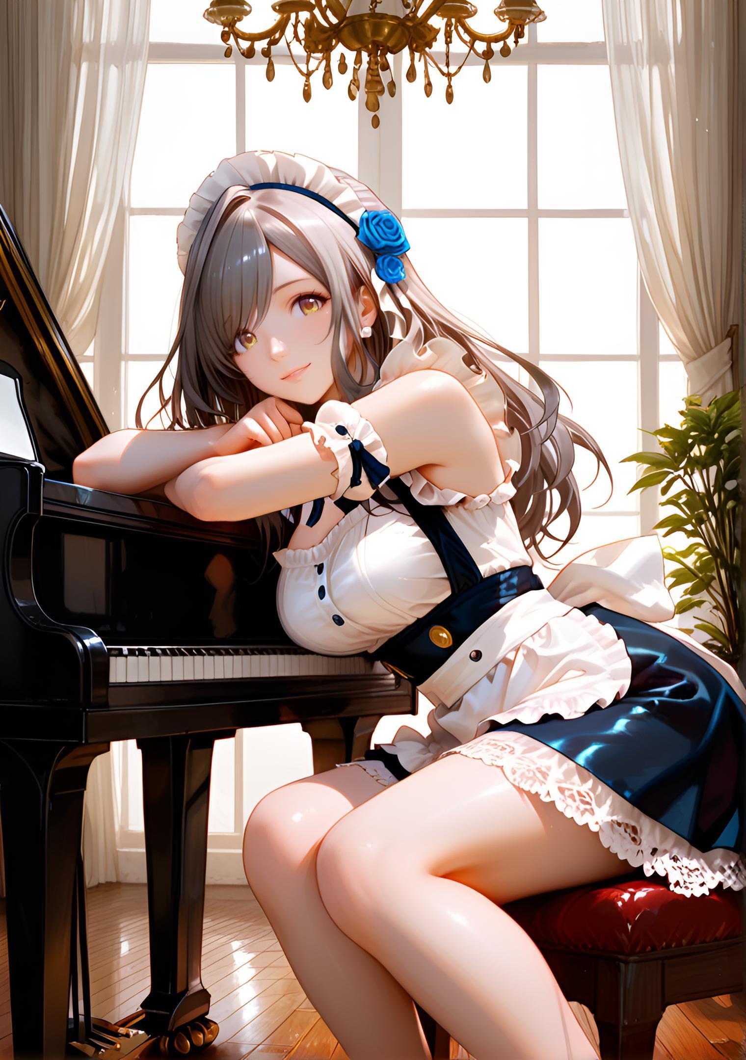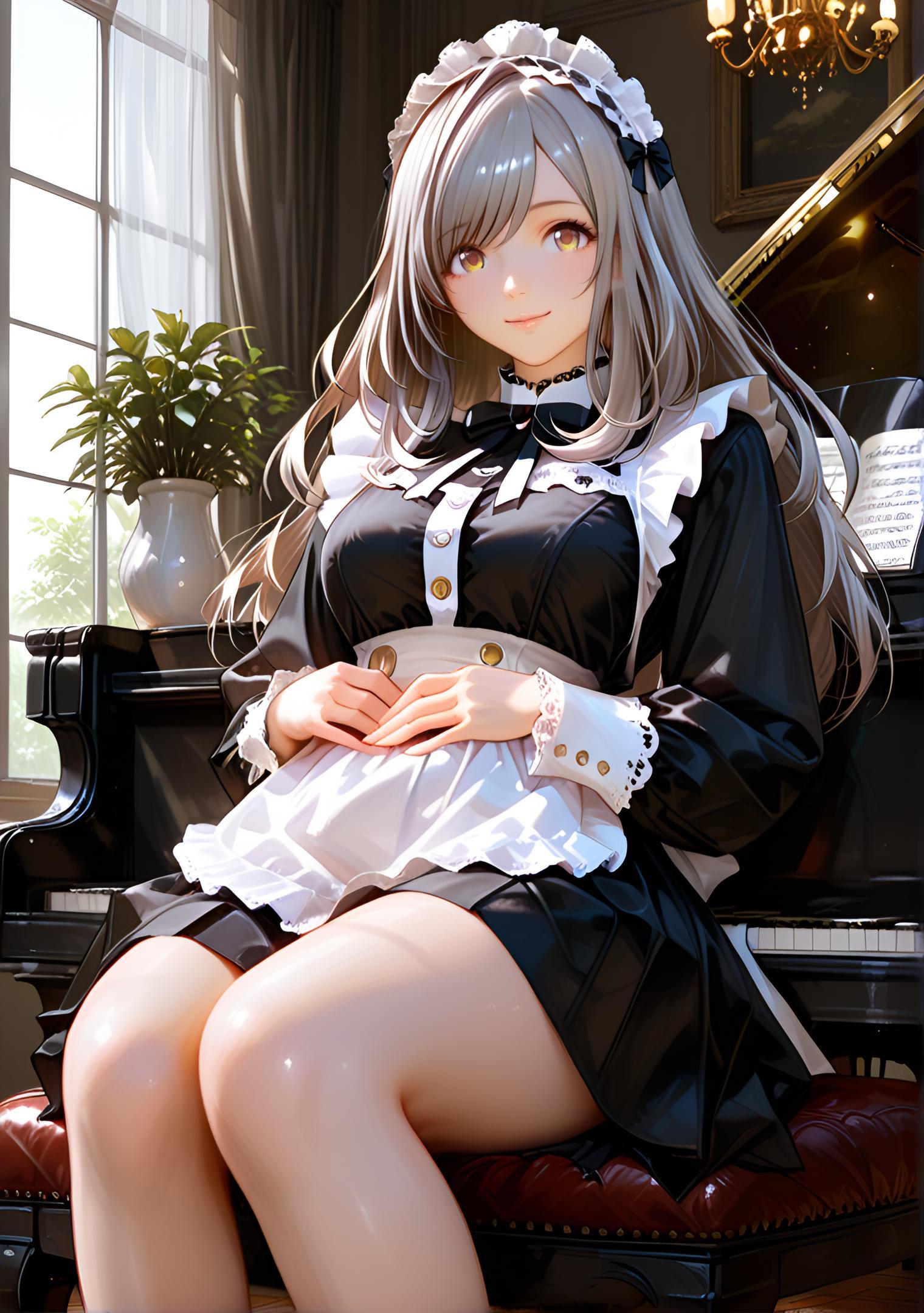 - black maid dress with subtle indigo sheen, glossy satin apron, frilled high collar, lace gloves, silver hairpin and stockings with faint shimmer # ミッドナイトシルキーメイド