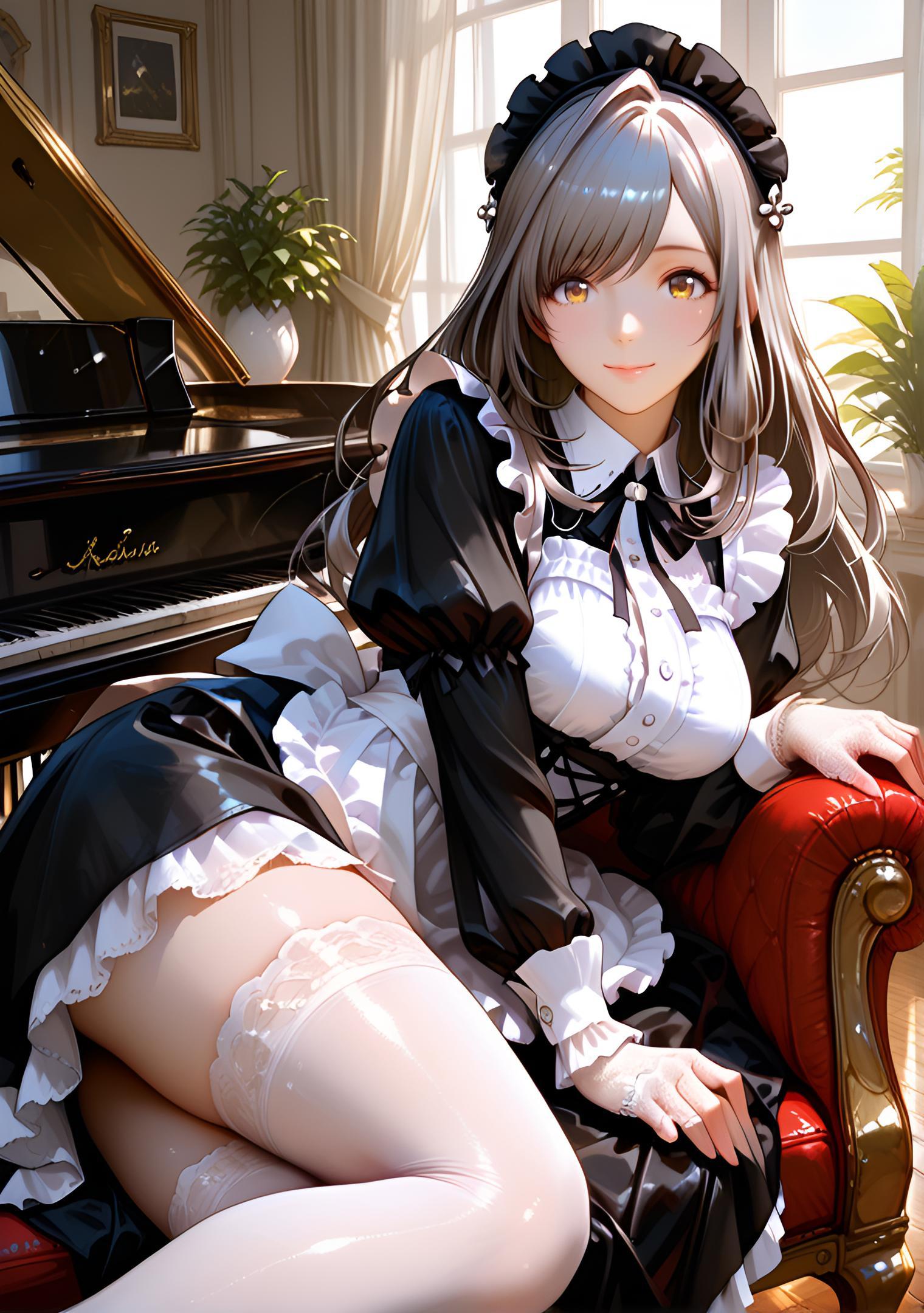 - classic black and white maid dress with crisp apron, puff sleeves, lace-trimmed collar, glossy satin ribbons, white frilled headband, black stockings, polished shoes, pearl brooch # ノワールクラシックメイド