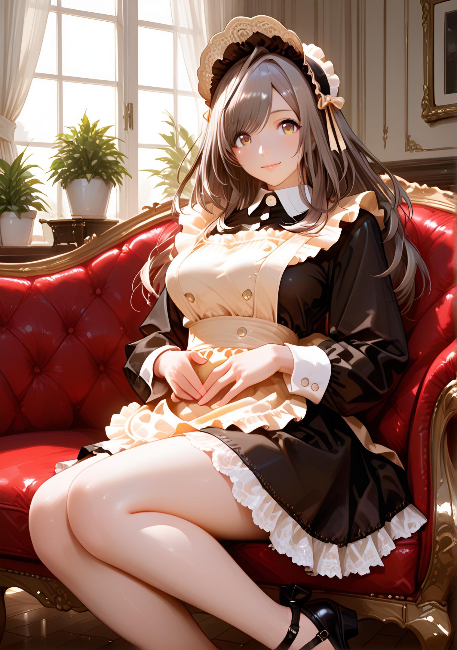 - deep crimson maid outfit with ivory apron, soft matte fabric, flared skirt, lace gloves, cream ribbon on chest, matching bonnet with frills # クリムゾンロイヤルメイドドレス