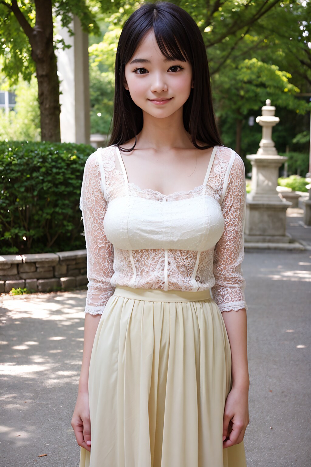 Tiered skirt, lace-up blouse, platform sandals