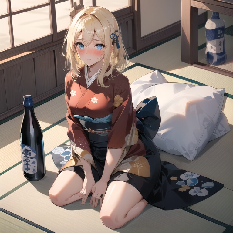 慣れない着物を着て、恥じらいながら和室でペタンと正座