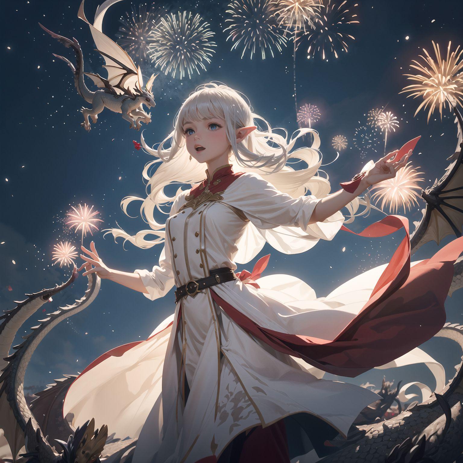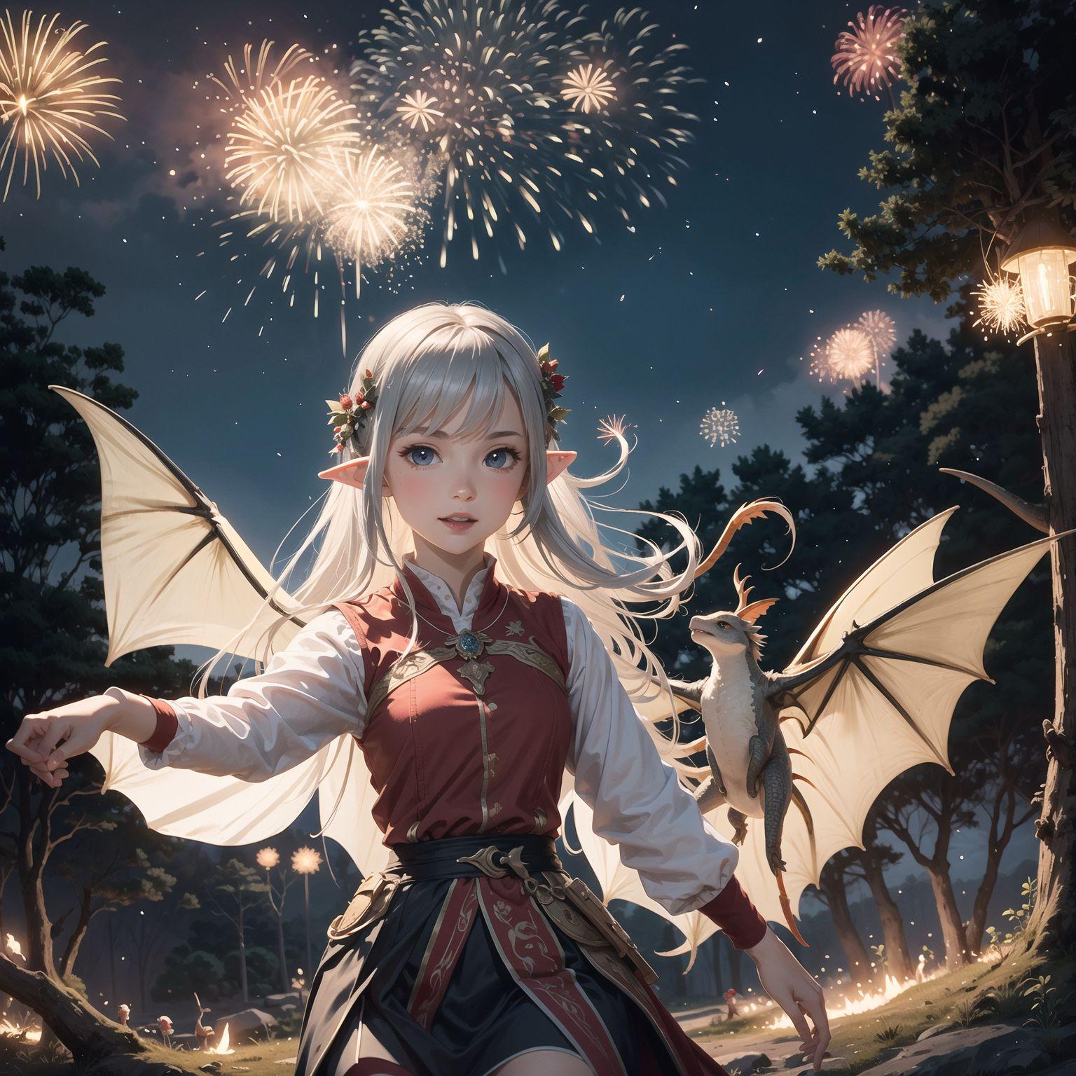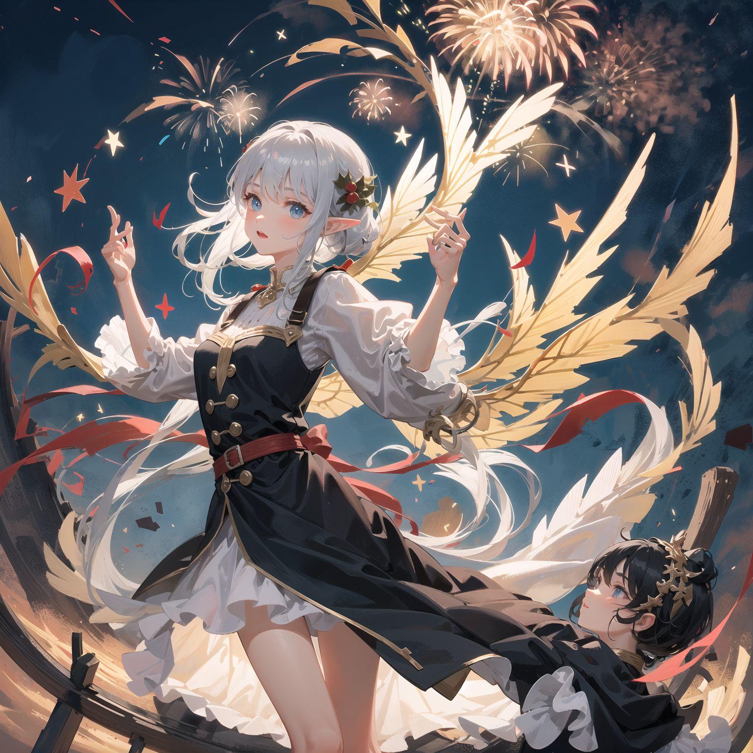 リリアの後ろには、小さな妹フィーナも同じ夢を見ていたかのように、喜びに満ちた表情で花火を見上げている。姉妹の絆は、この夢の中でも、彼女たちを繋ぎ、支え合う力になっていた。