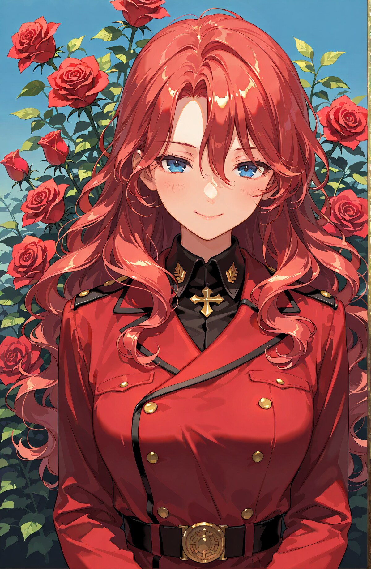 ・歴史ものなので今回も油絵風に。企画ページの赤薔薇のランカスター家のサンプル通り、人物にknight,red rose military uniform, を指定。背景にred roseを指定しています。髪が赤いキャラで赤い服だとやっぱり色が混みあってしまうのですが、今回だけということで...