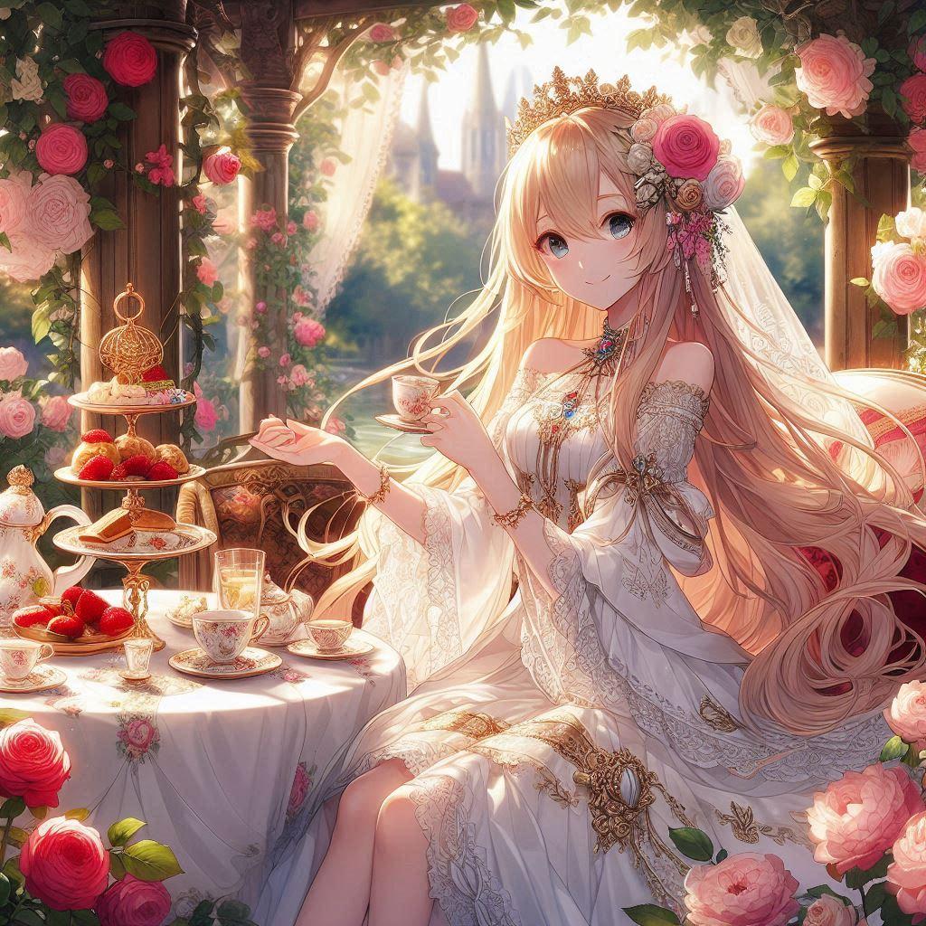 薔薇園で優雅にお茶するお姫様を生成してみました。