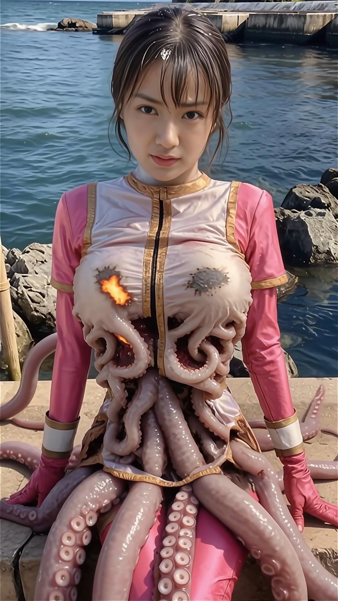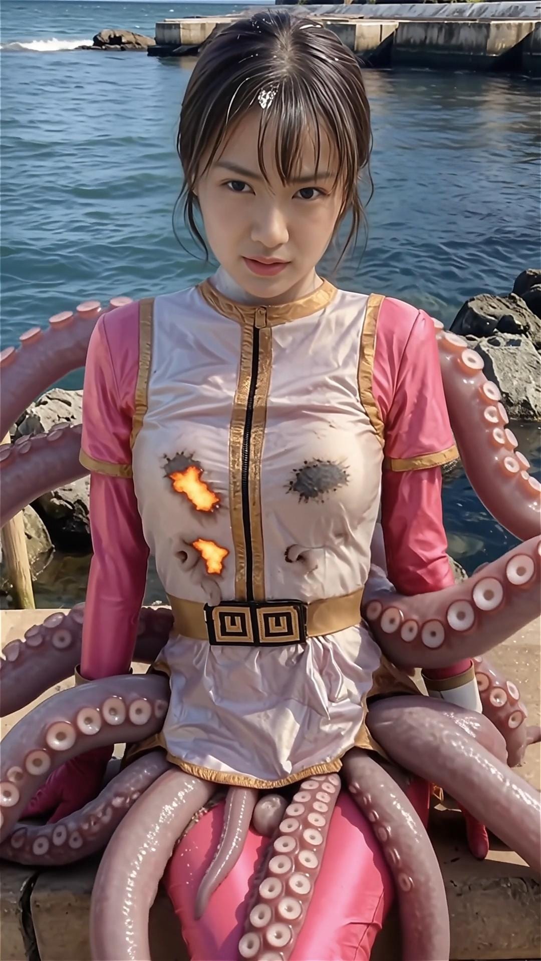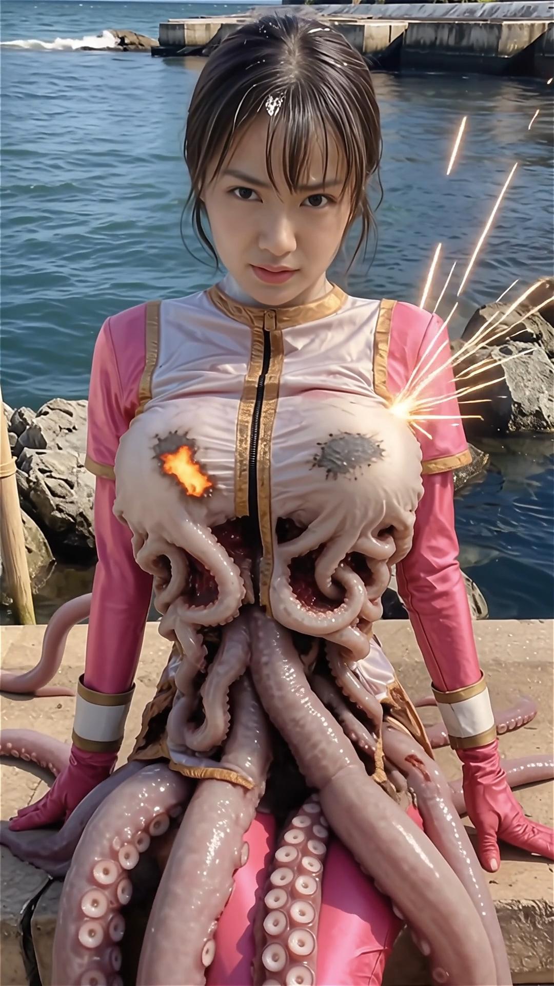 タコモンスターに襲われスーツ内部に侵入した触手が、内側からスーツを盛り上げる。胸が急激に膨らんだような恥ずかしさと、スーツ破壊の衝撃に声も出ない。