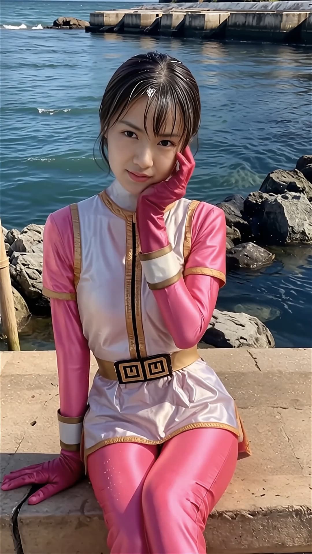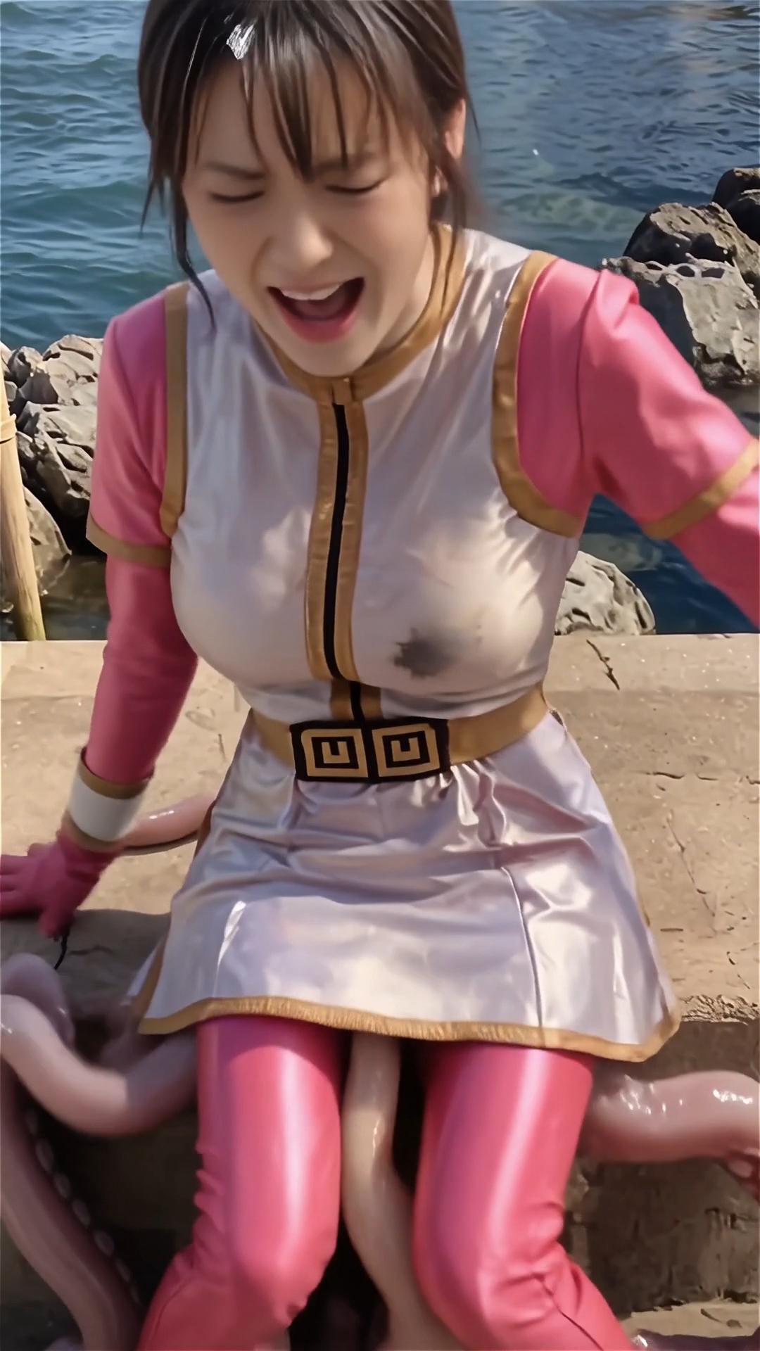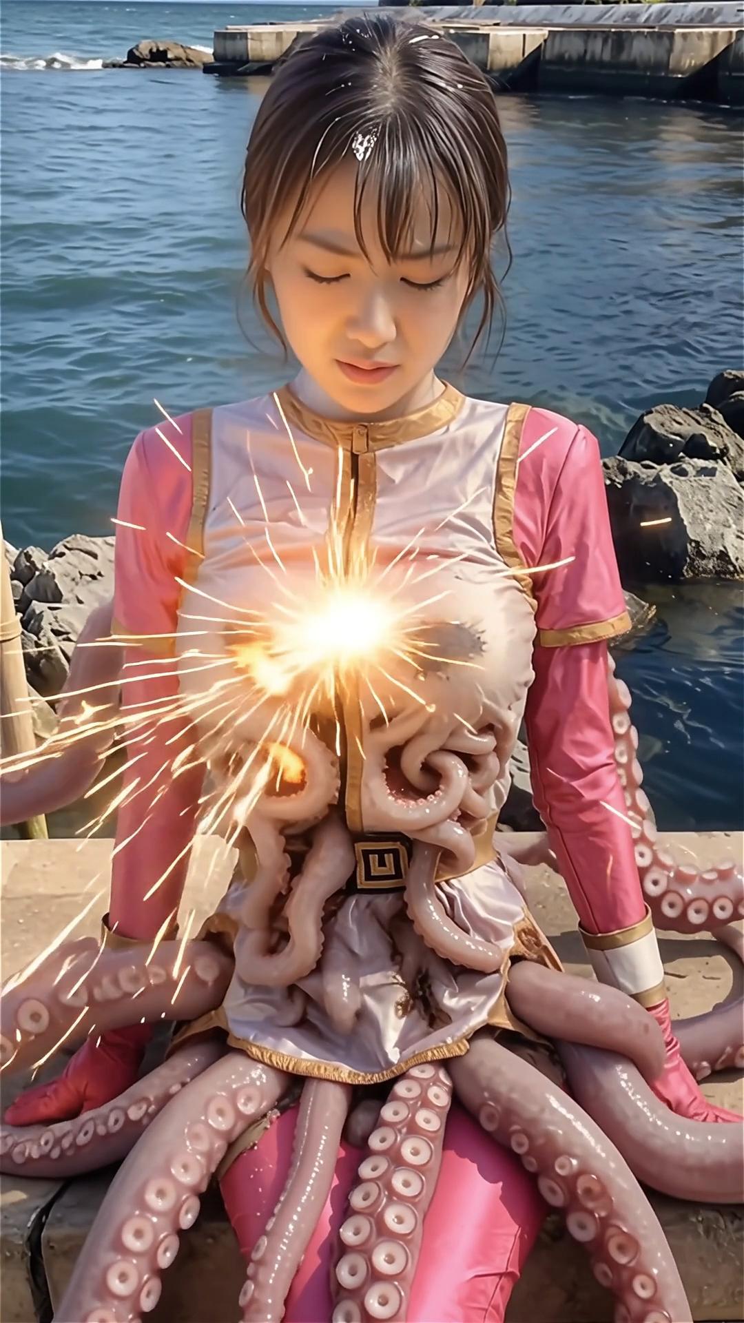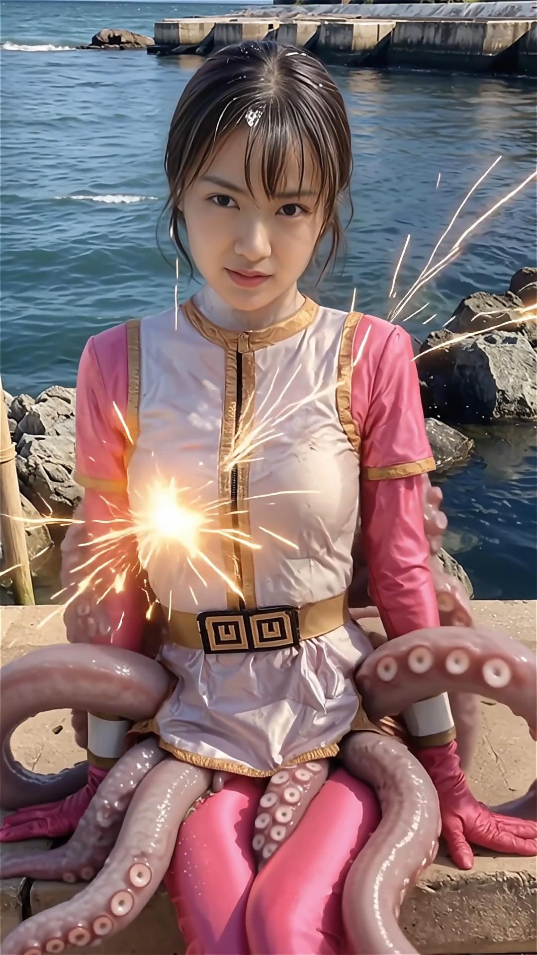 タコモンスターに襲われスーツ内部に侵入した触手が、内側からスーツを盛り上げる。胸が急激に膨らんだような恥ずかしさと、スーツ破壊の衝撃に声も出ない。