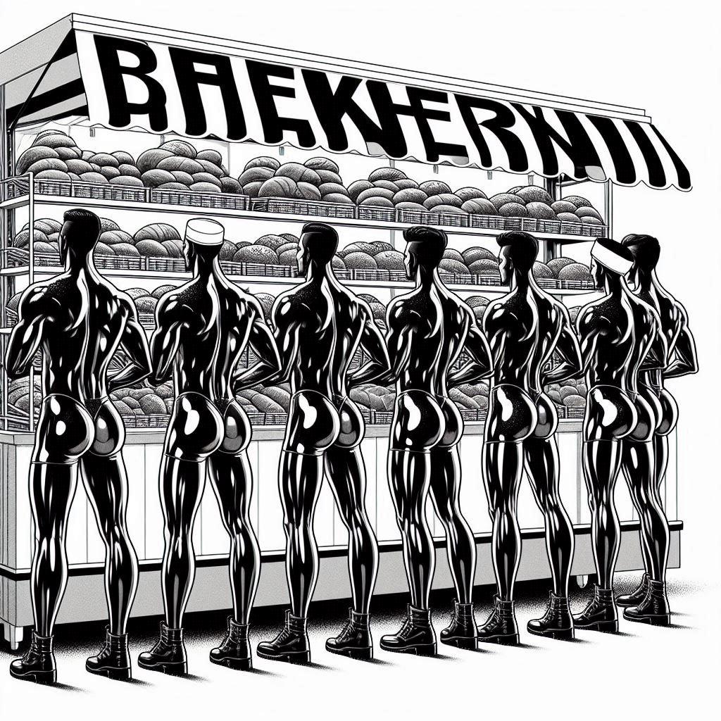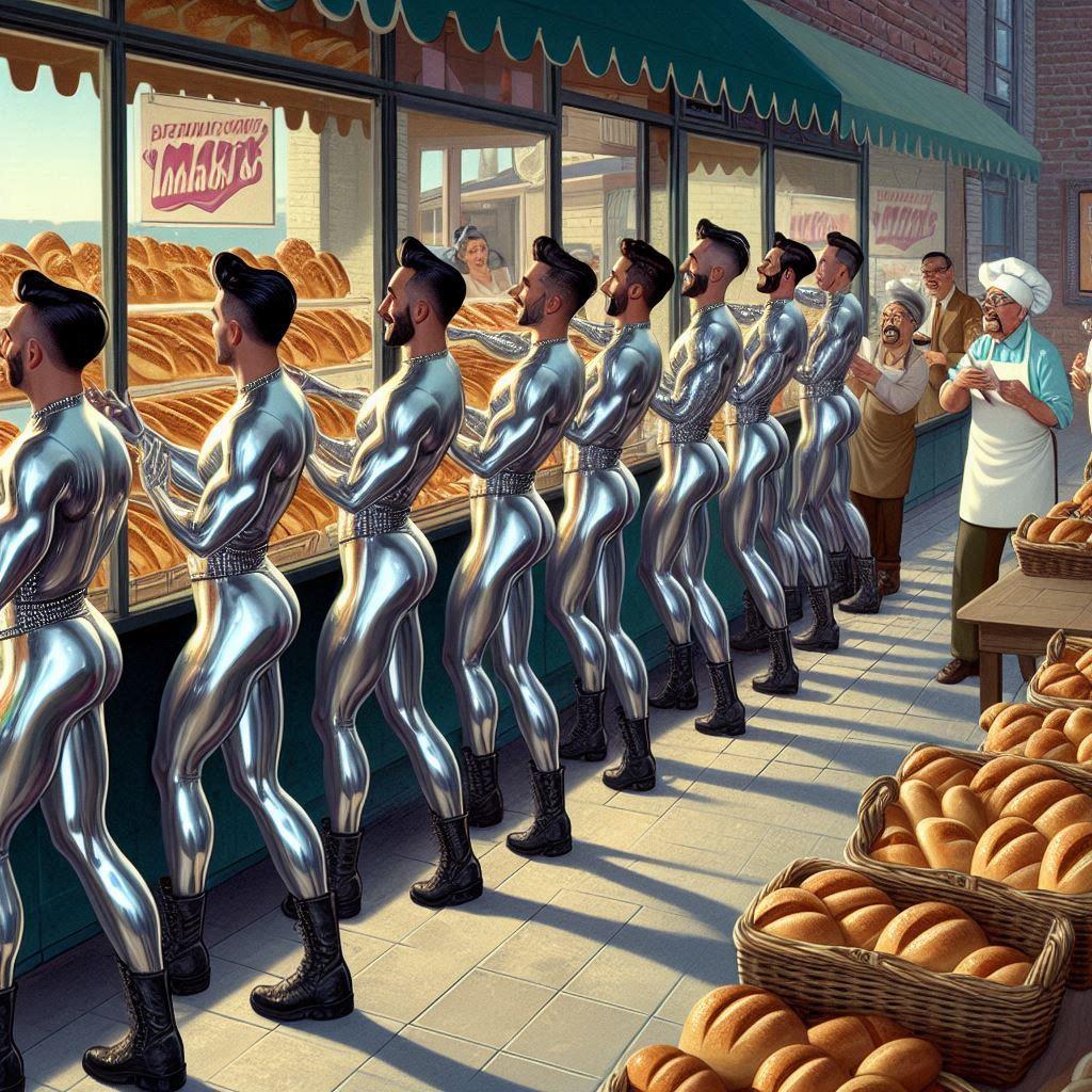 反射するタイツを付けている男性たちが並ぶパン屋さん