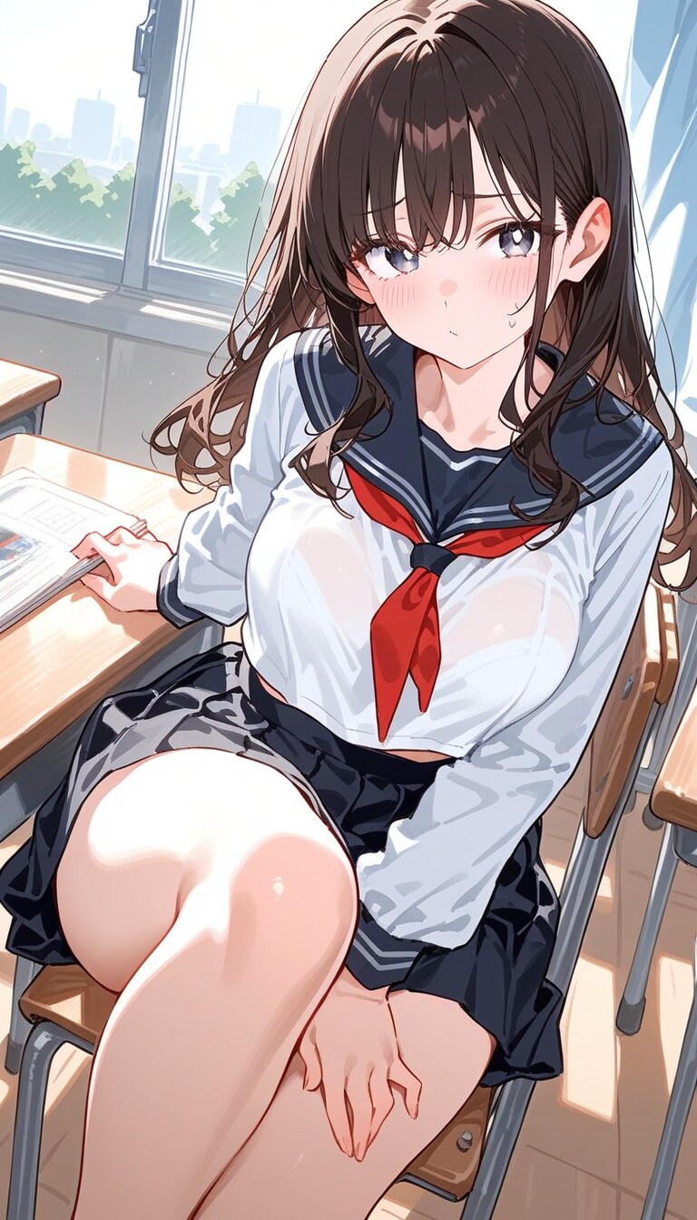 1 girl, 12 yo, dark brown hair, black eyes, middle hair, large breasts, large hips, school sailor uniform, red ribbon tie, black skirt