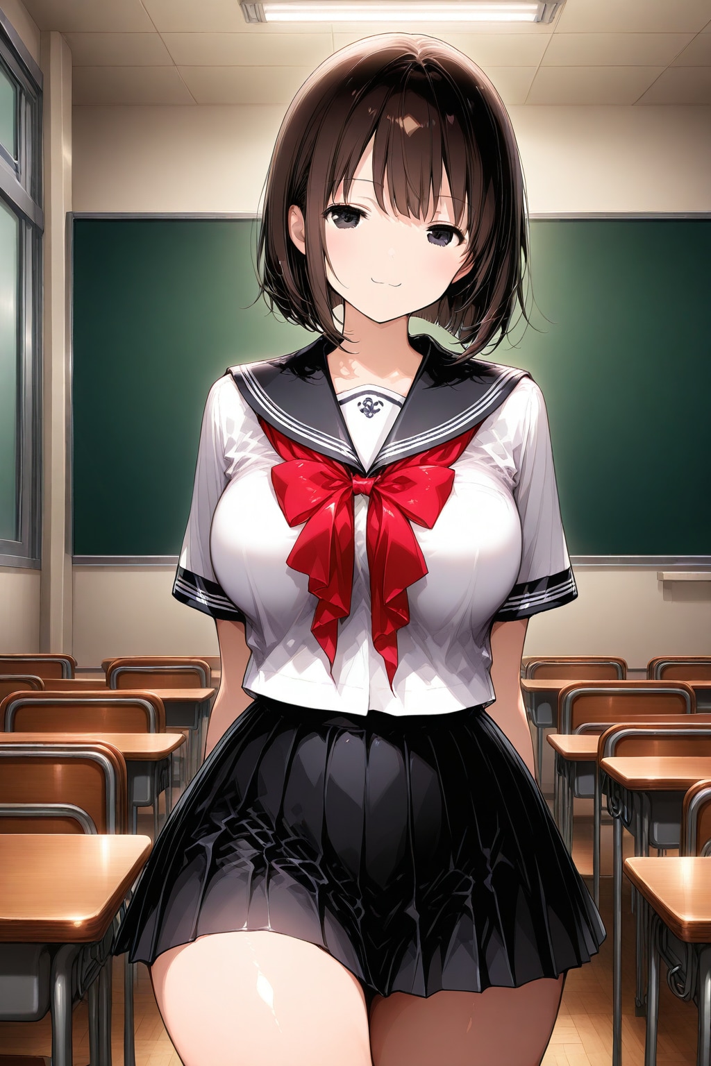 1 girl, 12 yo, dark brown hair, black eyes, bob cut, large breasts, large hips, school sailor uniform, red ribbon tie, black skirt