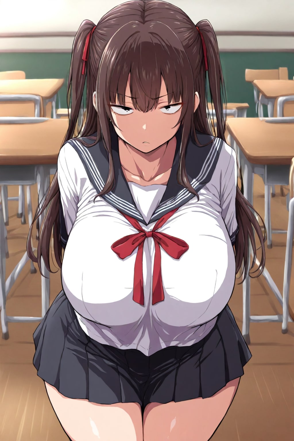 1 girl, 12 yo, dark brown hair, black eyes, sanpaku eyes, two side up, huge breasts, large hips, school sailor uniform, red ribbon tie, black skirt