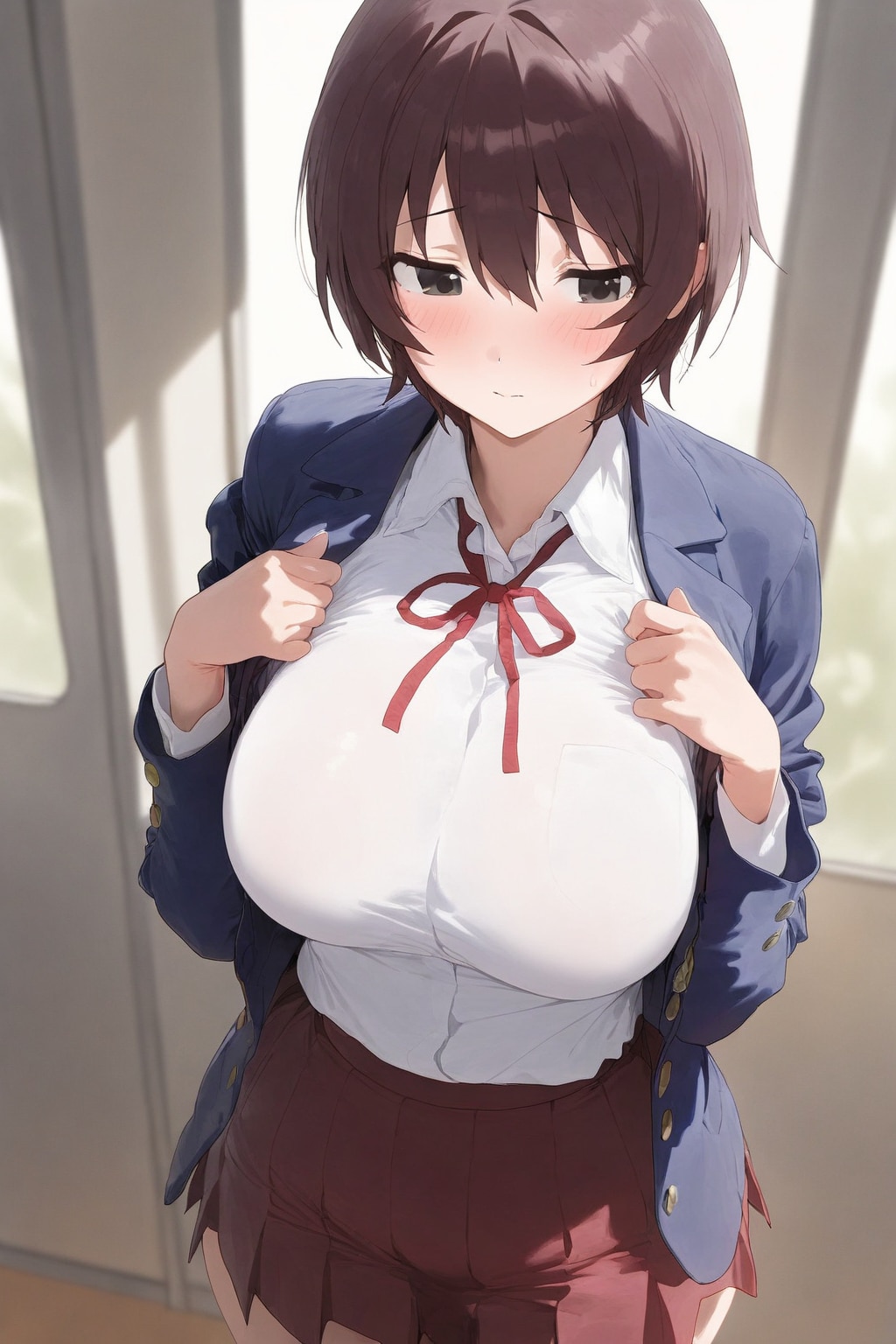 1 girl, 14 yo, dark brown hair, black eyes, short hair, large breasts, large hips, school blazer uniform, deep blue blazer, white shirt, red ribbon tie, red skirt