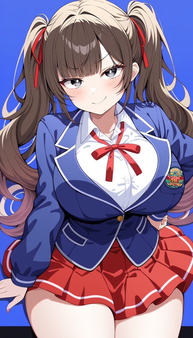 1 girl, 14 yo, dark brown hair, black eyes, sanpaku eyes, twintails, large breasts, large hips, school blazer uniform, deep blue blazer, white shirt, red ribbon tie, red skirt