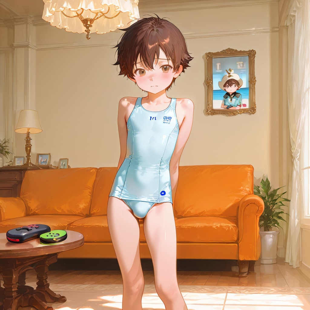 メイド達に拝み倒されて女性用競泳水着を着るハメになっちゃった成司坊ちゃま