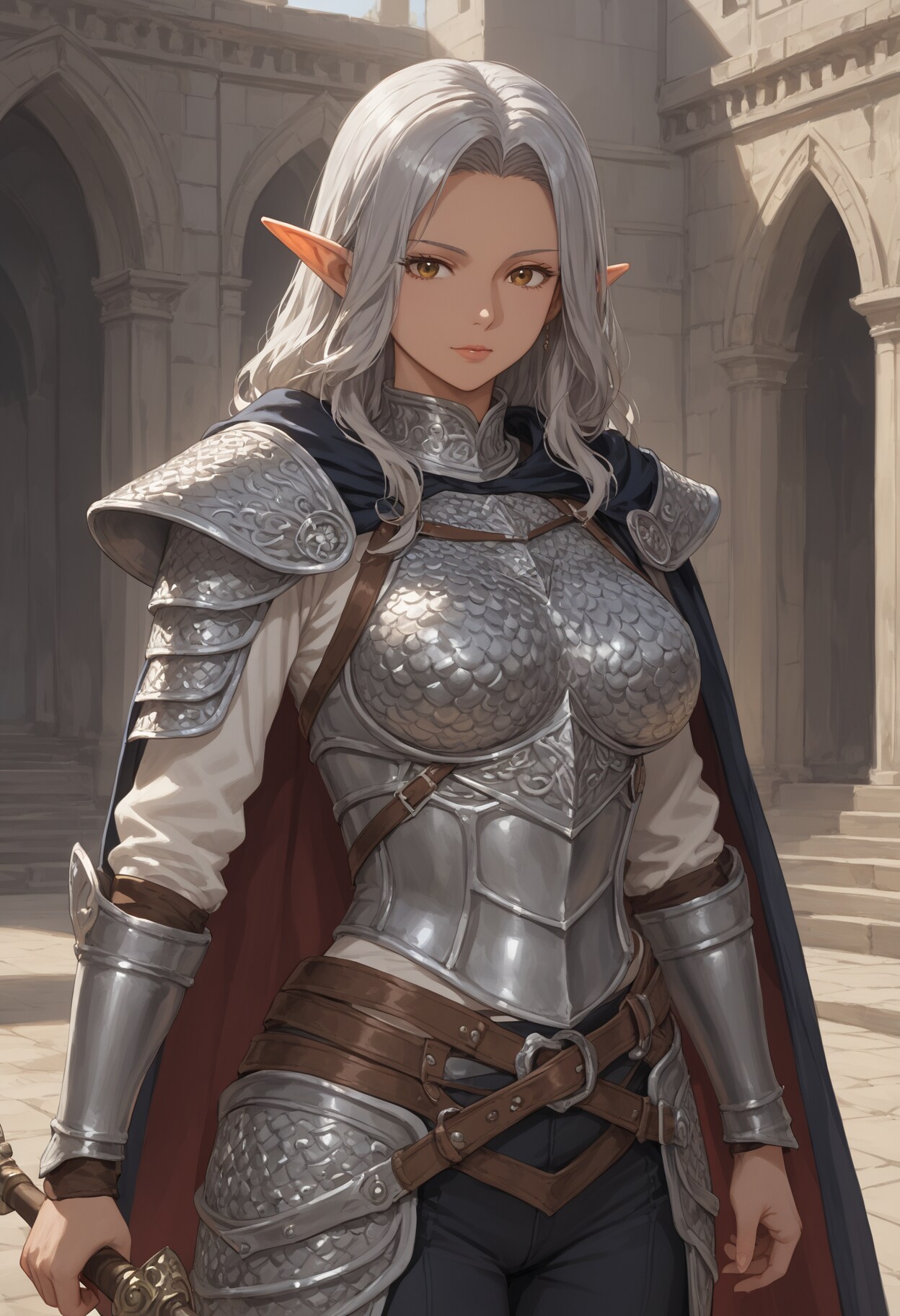 silver colored detailed metal Full-Plate-armor, fantasy designed metal colored Chainmail inner armor long sleeves shirt, fantasy designed metal colored Chainmail inner armor long pants, fantasy designed cloak, fantasy designed weapon, there with extremely detailed, fantasy style, elaborate, stylish cool