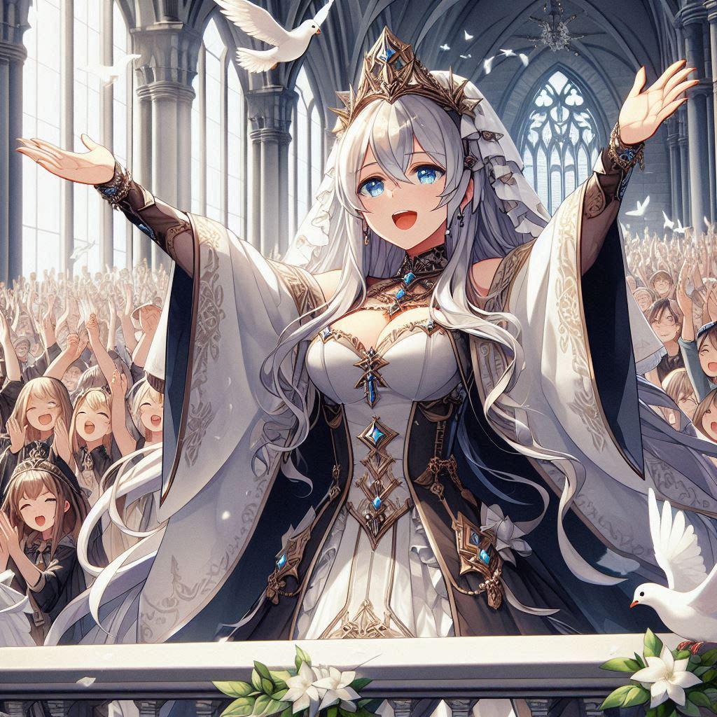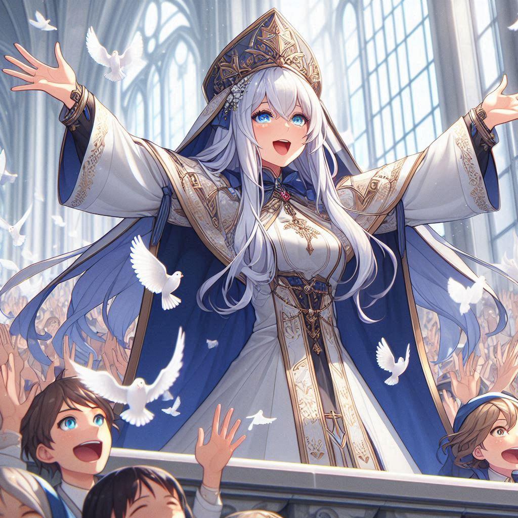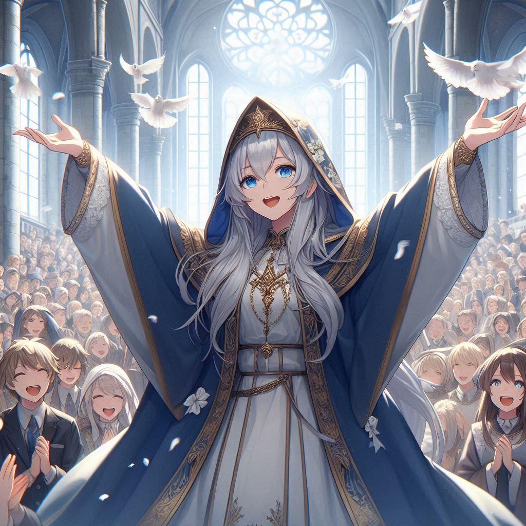 詠唱の終わりと同時に天から最高司祭に光が降り注ぎ、熱狂する信者と魔王討伐に選ばれた勇者たちの下に散らばっていくのであった!