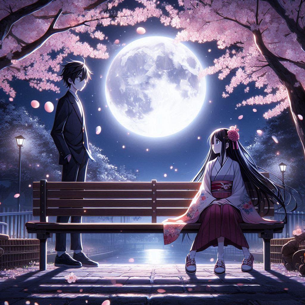 春の夜、桜が満開の公園で、美咲は一人ベンチに座っていた。満月の光が彼女の長い黒髪を銀色に染め、その姿は絵画のように美しかった。