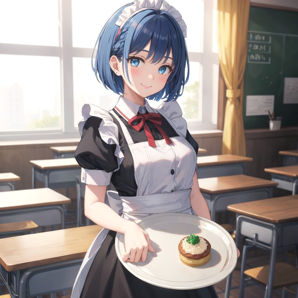 「お待たせしました。ご注文のケーキですぅ」ちちぷい学園祭の一コマ、文化祭のメイド喫茶であいちゃんが笑顔を振りまいています。