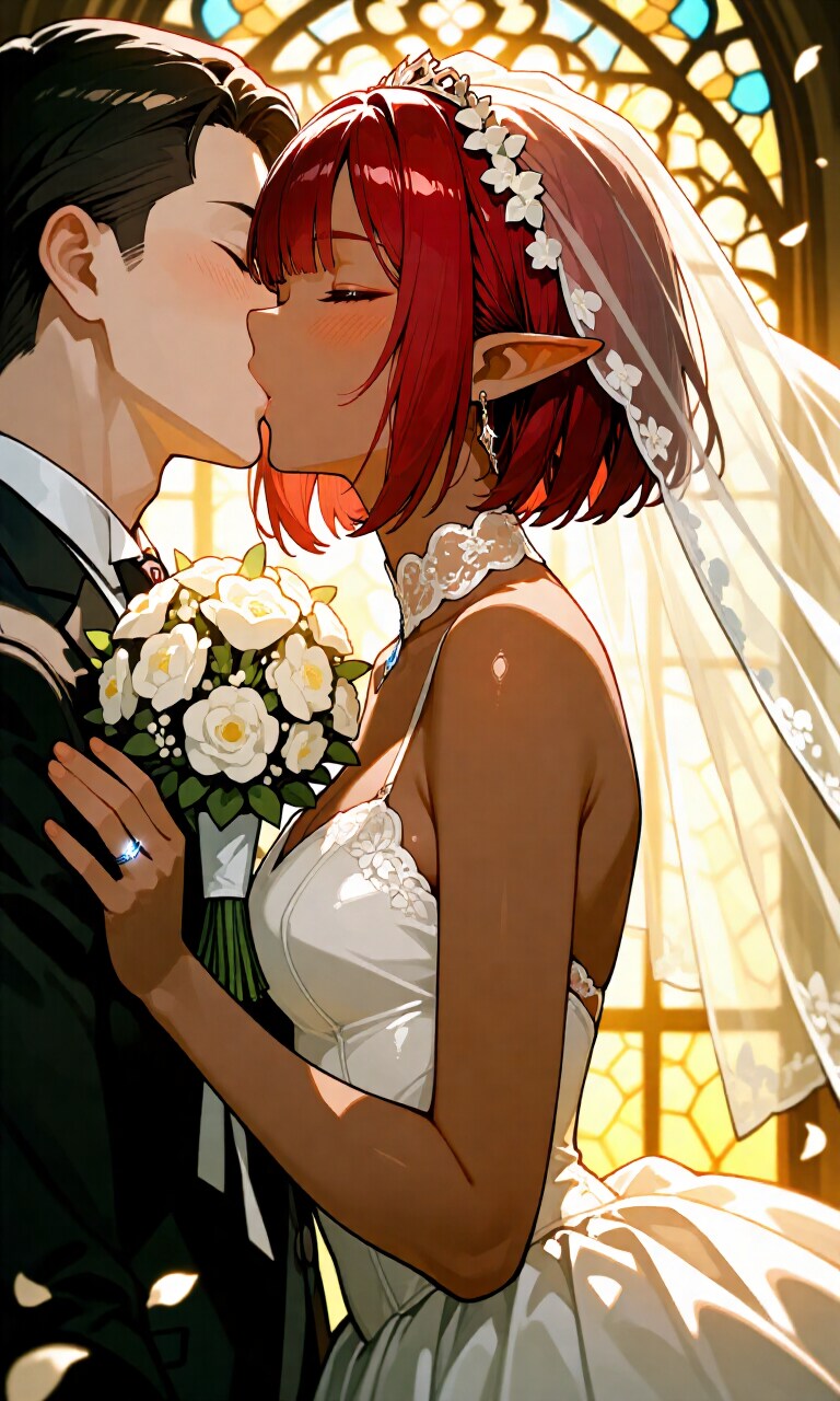 彼女は笑み、歓喜の涙を流し、誓いの口づけを重ね愛を誓う。