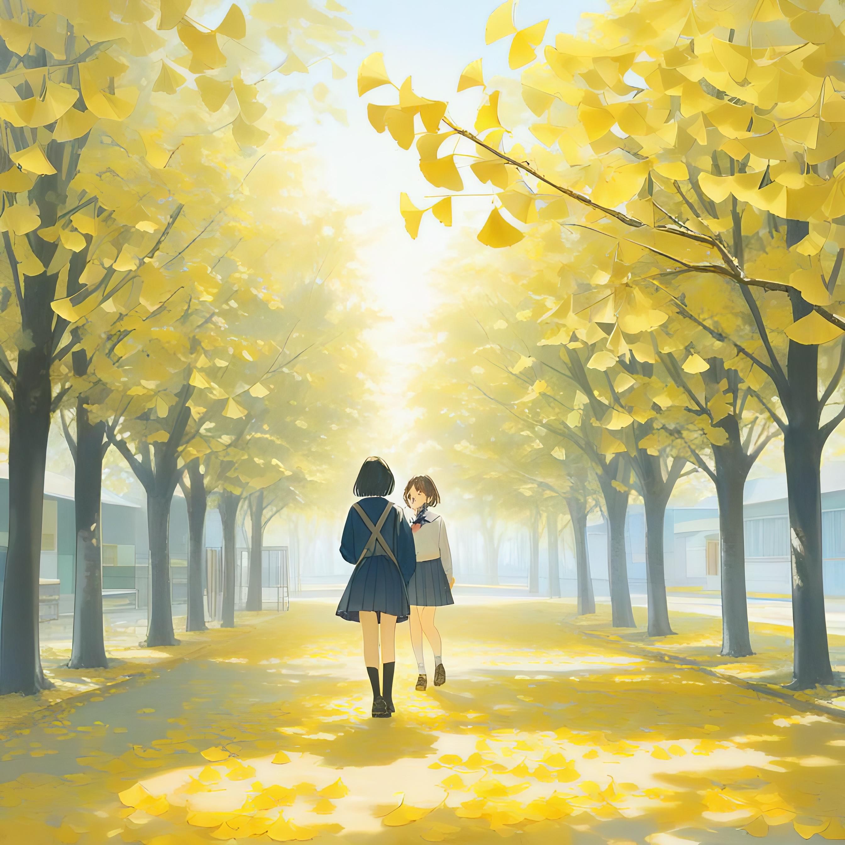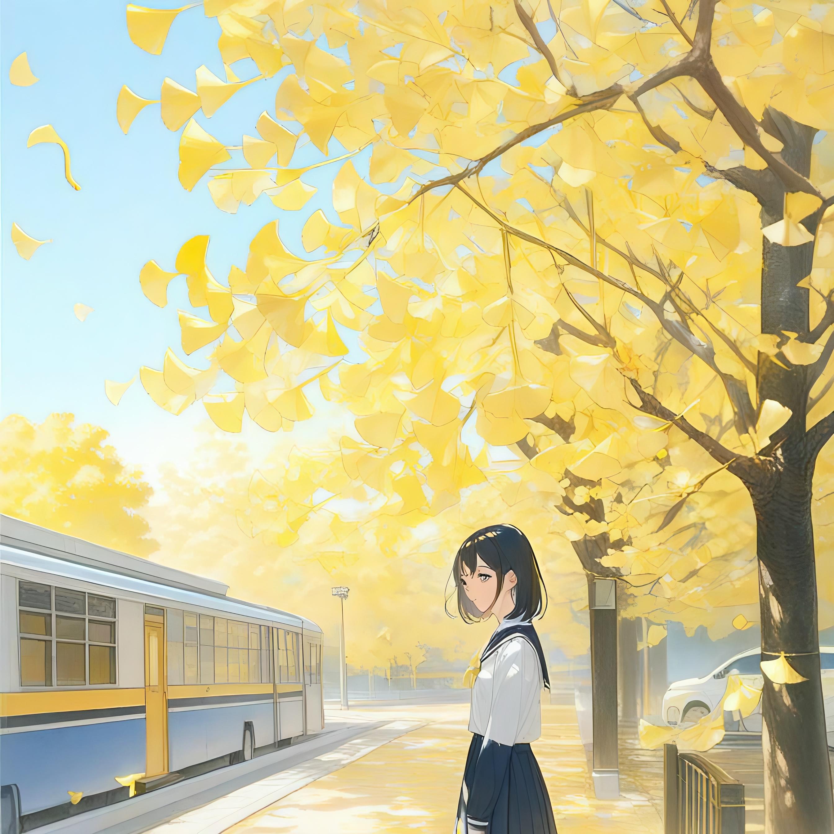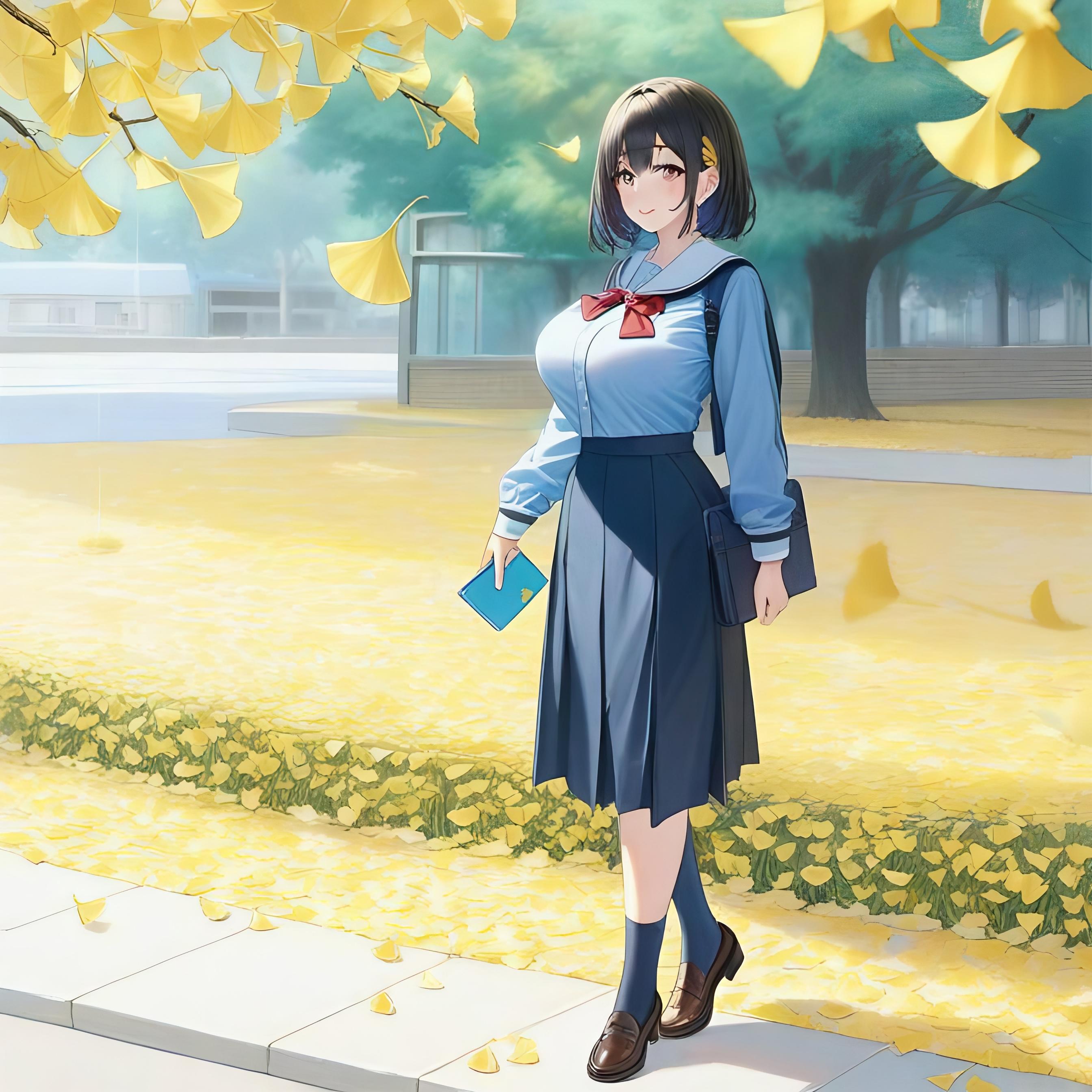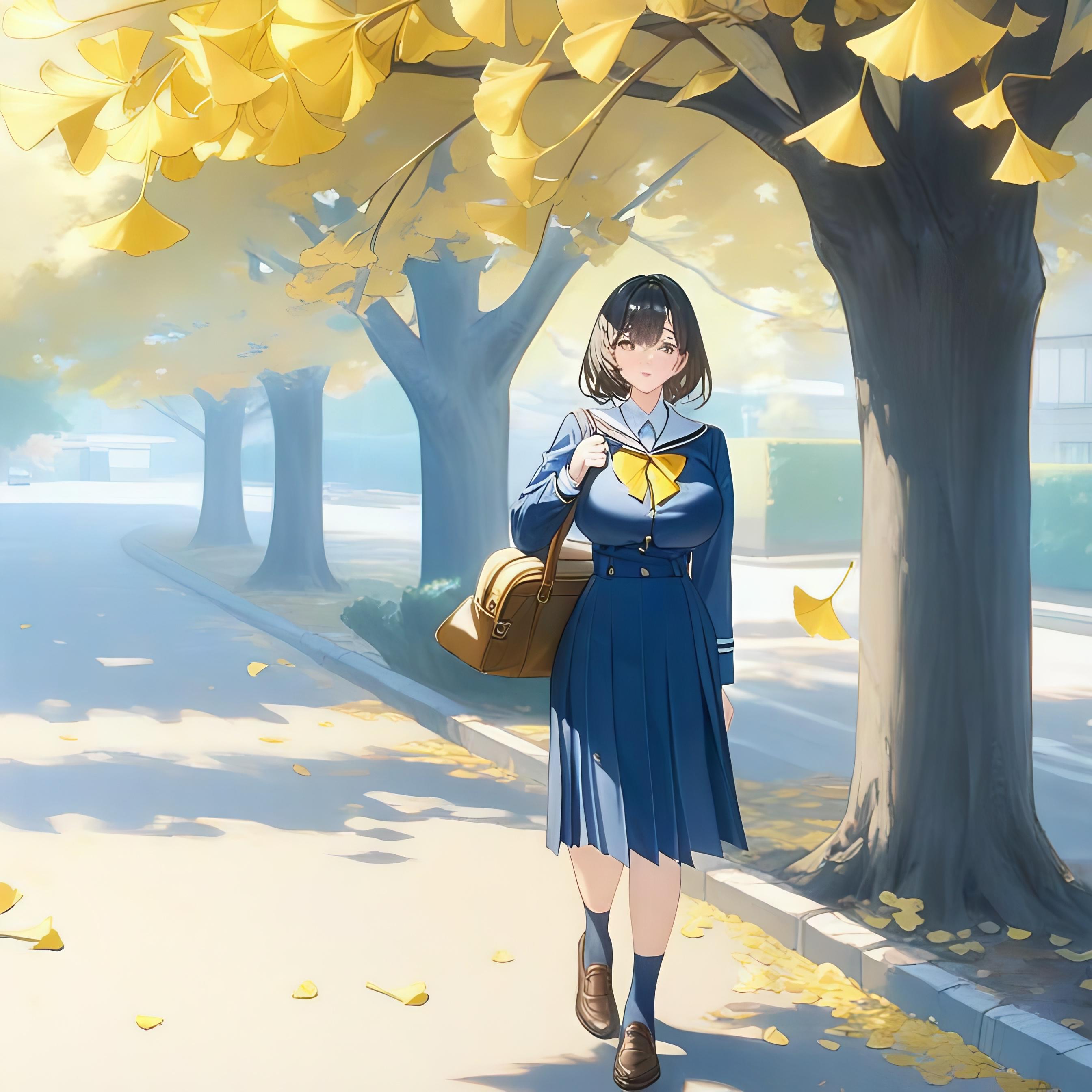 近所の通りの街路樹のイチョウが真っ黄色。中々綺麗でした。丁度帰宅のJKも一緒に。