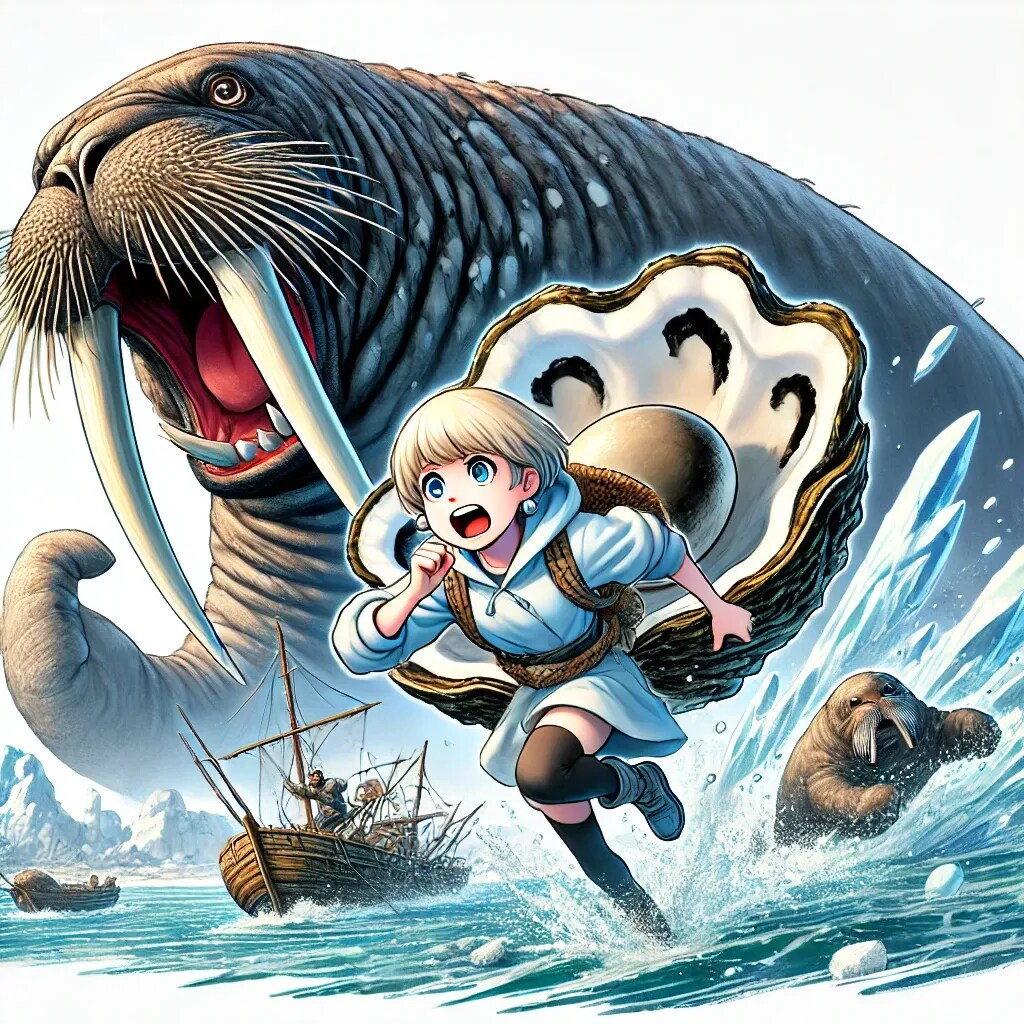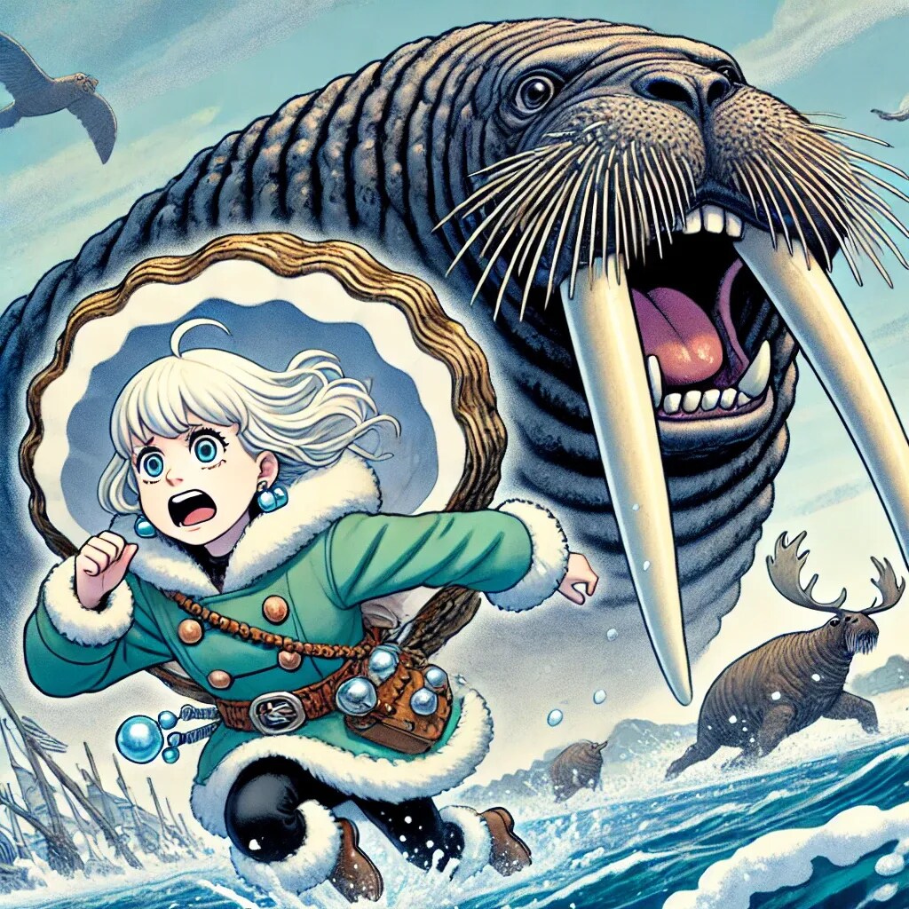 牡蠣の少女にとって、セイウチはまさに“天敵”であり、必死に逃げる姿がコミカルでありながらも切実なものに感じられます。