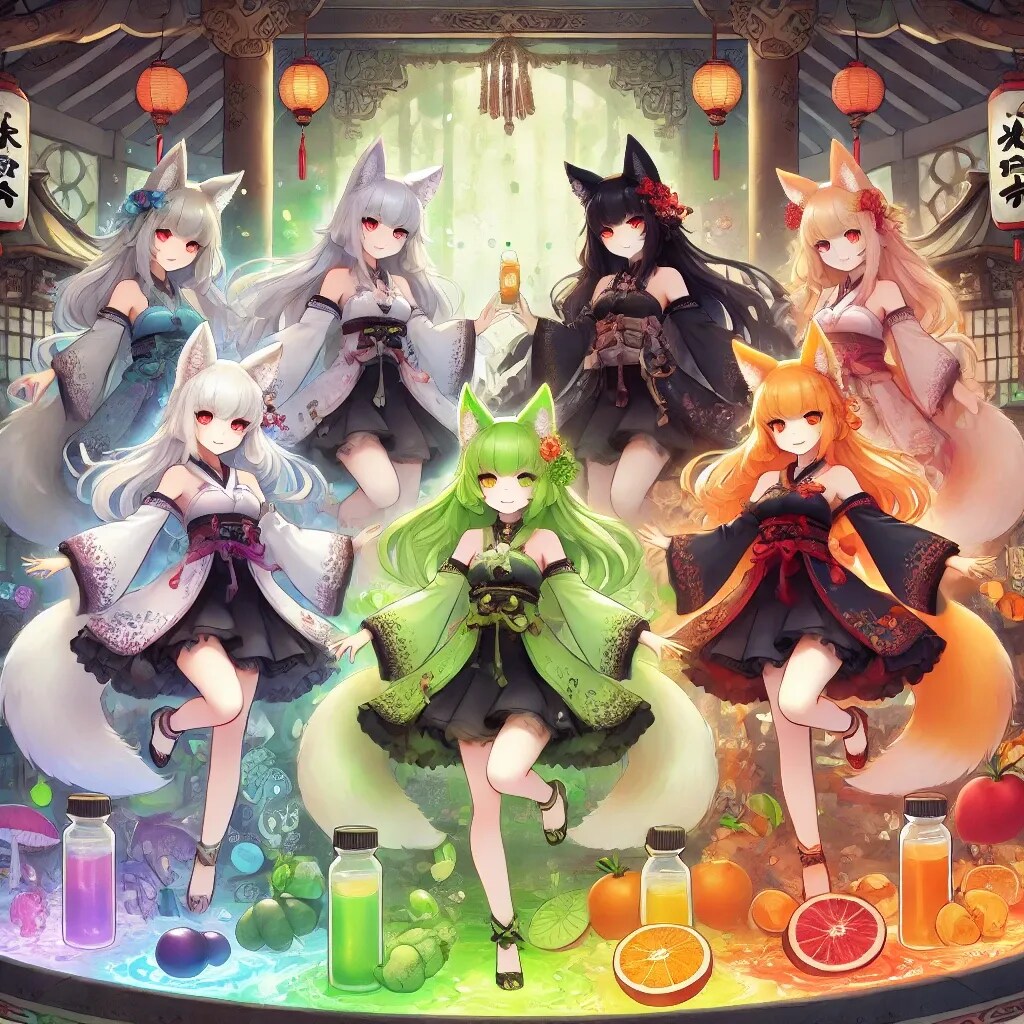 7色の狐耳少女たちは、薬膳菓子の「7色の外郎餅」に由来する生体細胞の能力を宿している という、とても神秘的で面白い設定ですね!⛩️🌿🌸