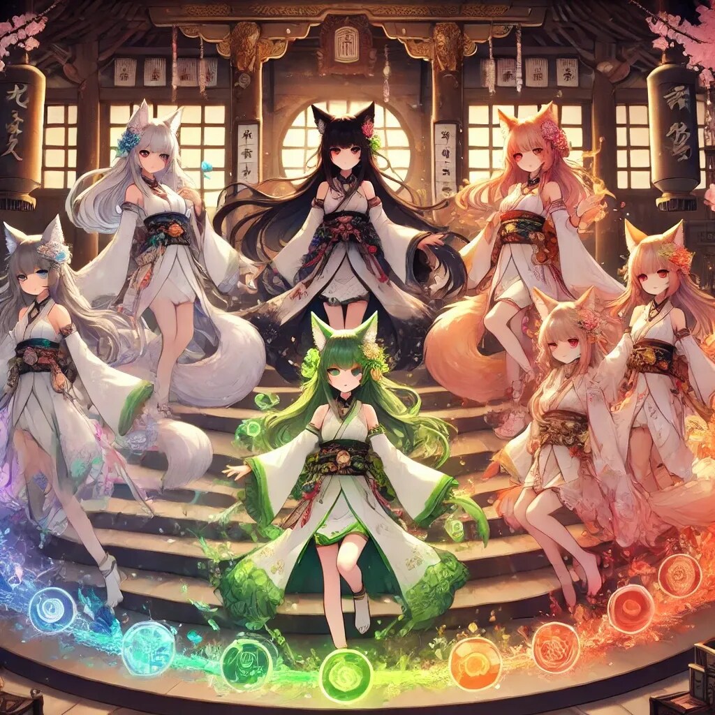7色の狐耳少女たちは、まるで「生体細胞の巫女」ですね!✨