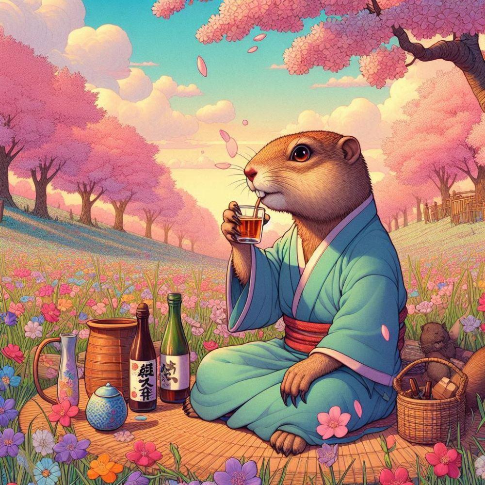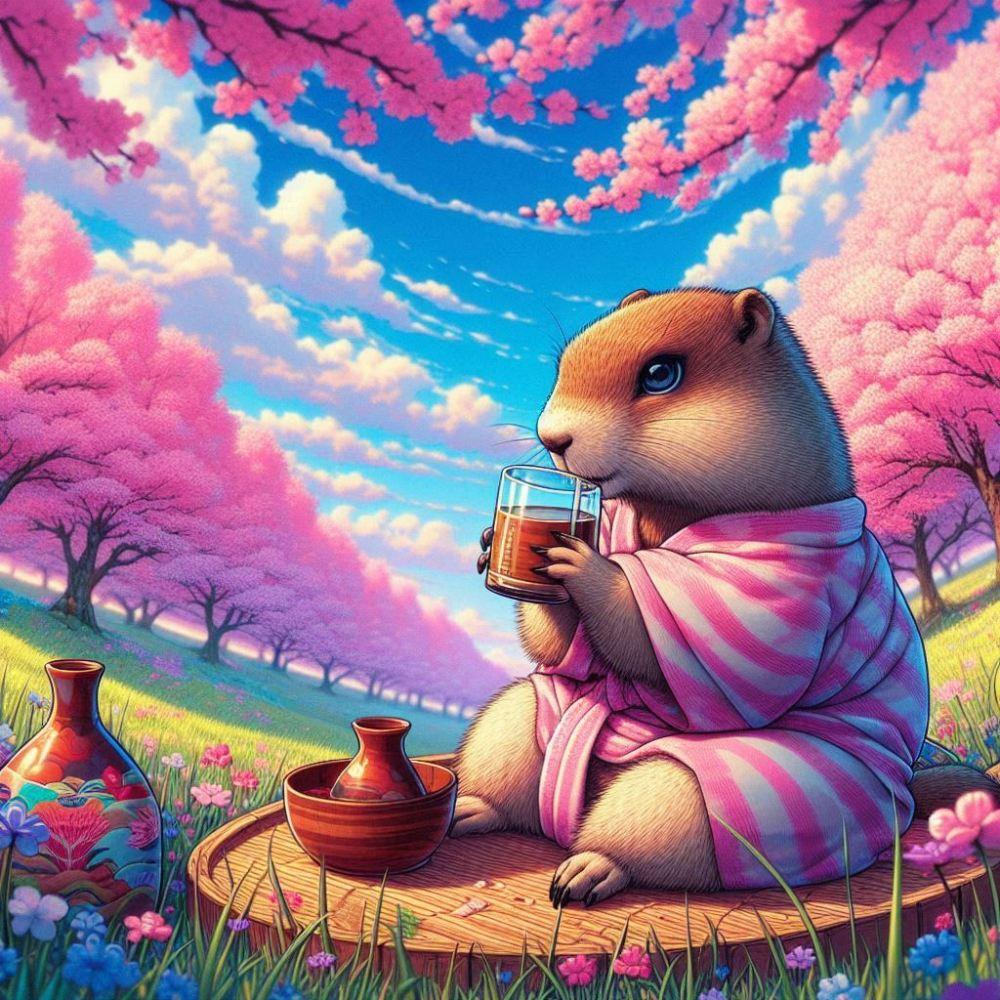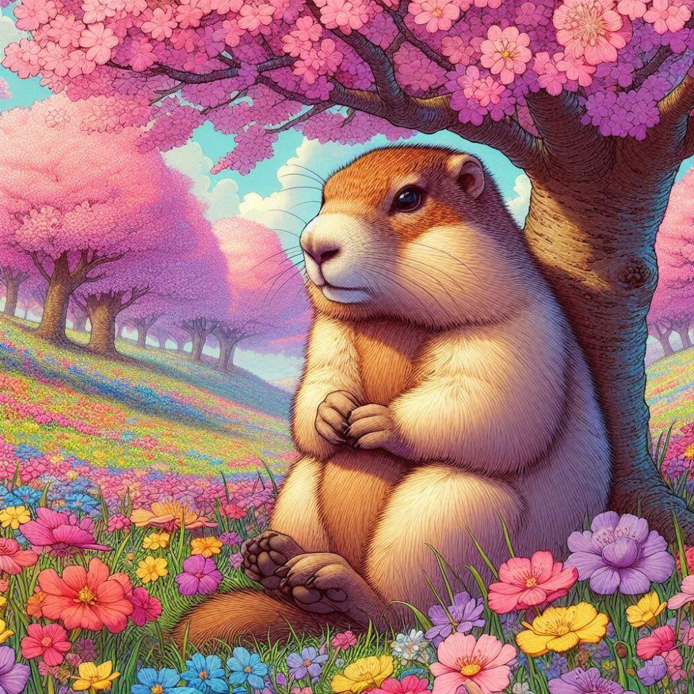 アニメ風、木下であぐらで座る瞑想&花見マーモット