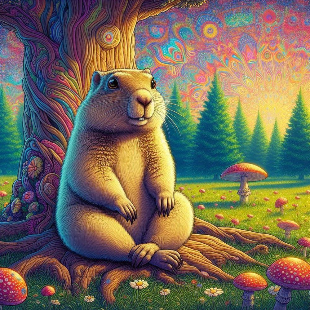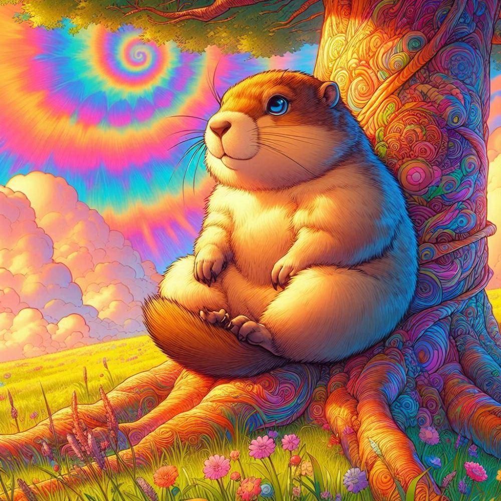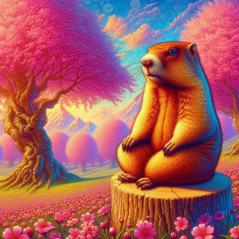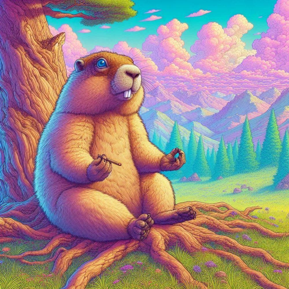 アニメ風、木下であぐらで座る瞑想&花見マーモット