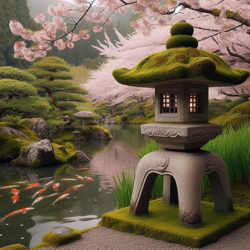 ⑤おまけの石灯籠。横を向いて鯉を見ています。向きがわからないって?光を照らす方向とか向きがあるはずです。