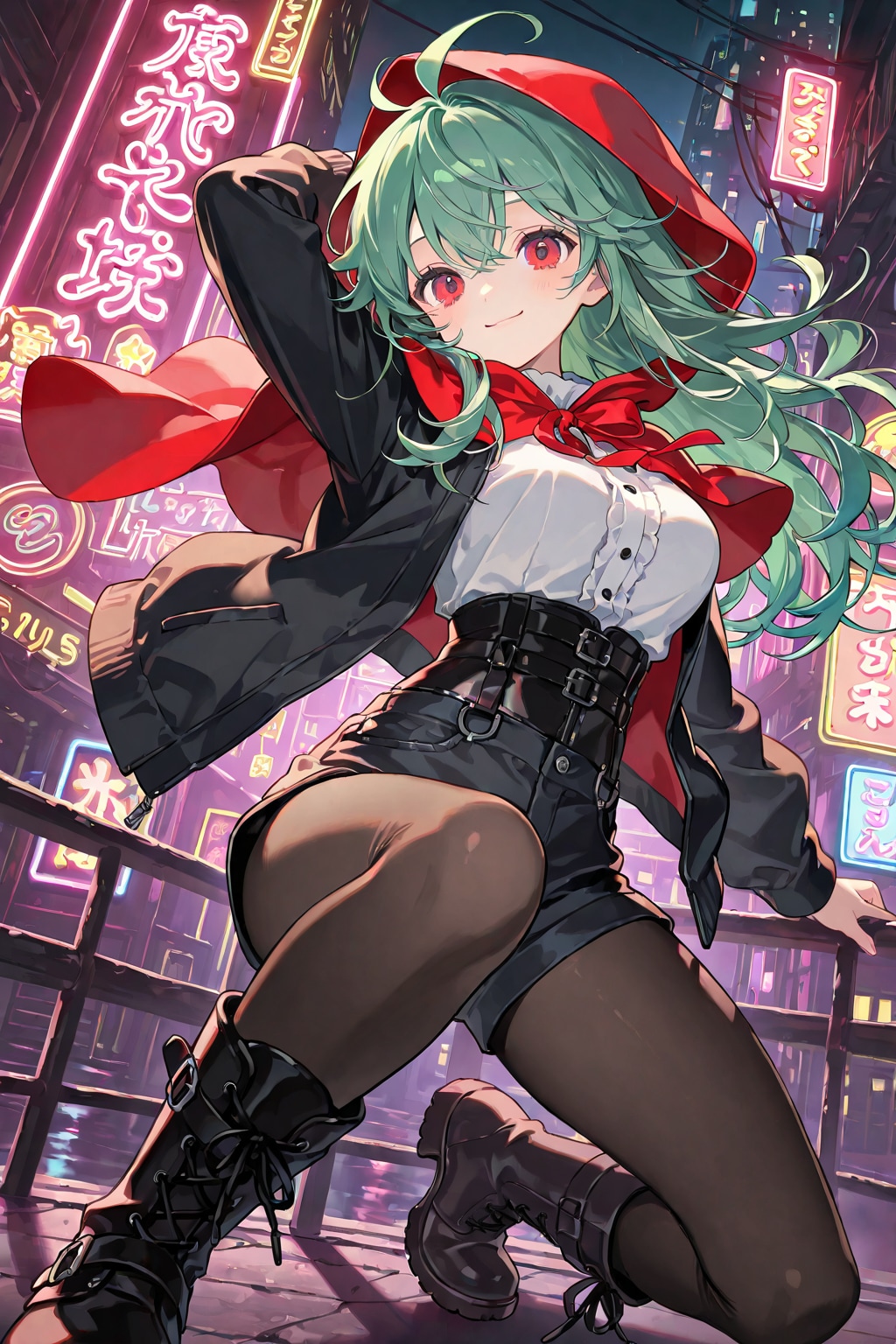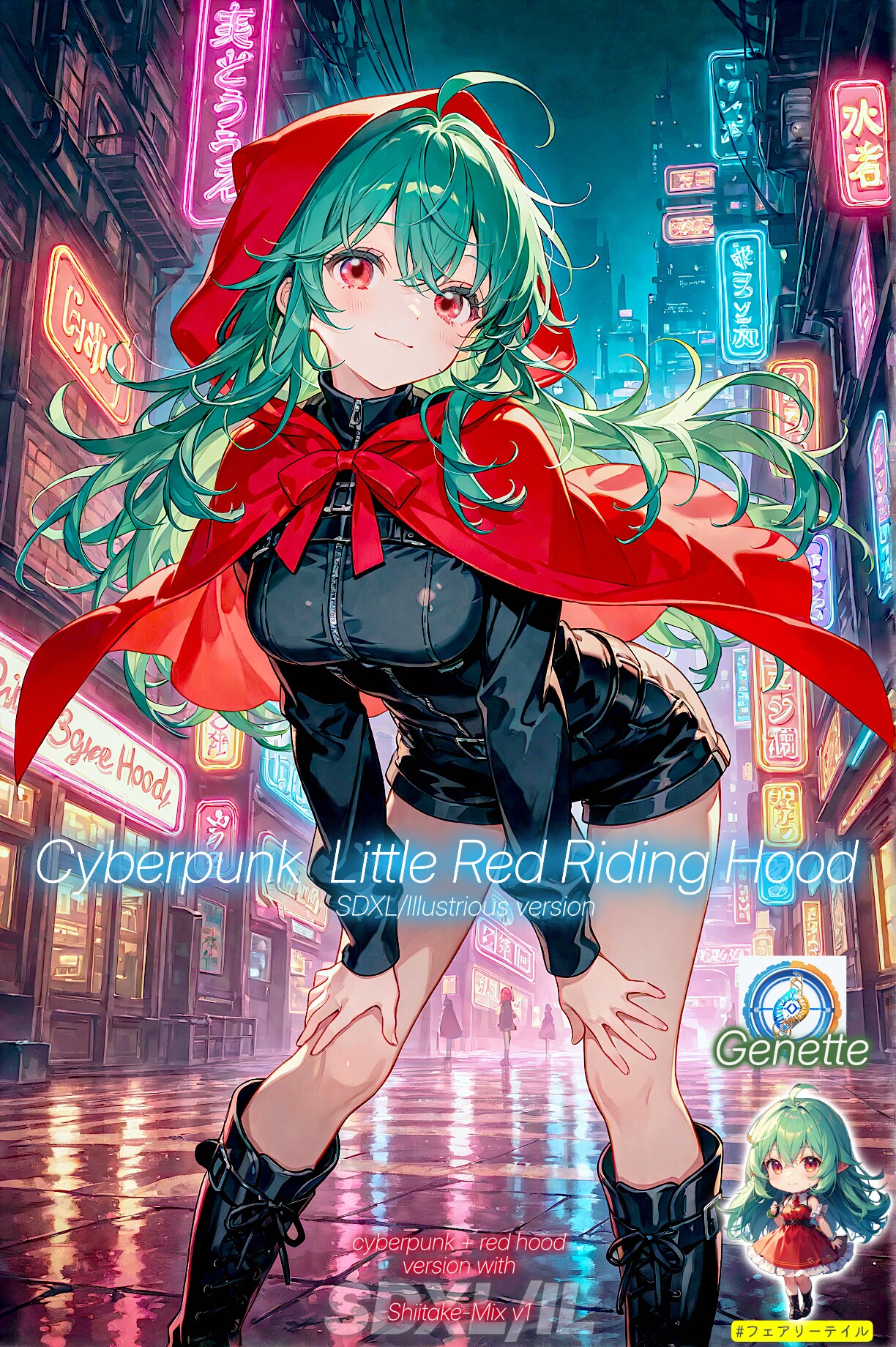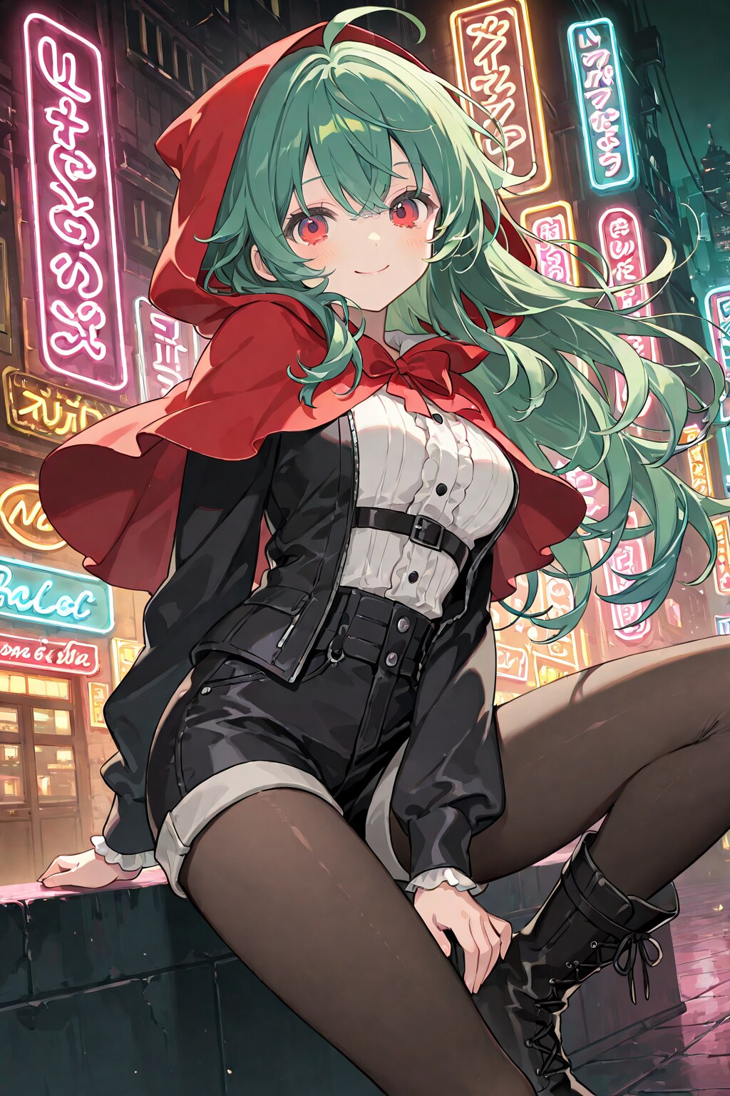 ・赤ずきんは有名なので学習されており、人物の服の指定に Little Red Riding Hood costume を加えることで再現できます。服は黒い鵜ジャケットにして対比を出して、サイバーパンクなアトモスフィアとネオンの光を加えて創りました。