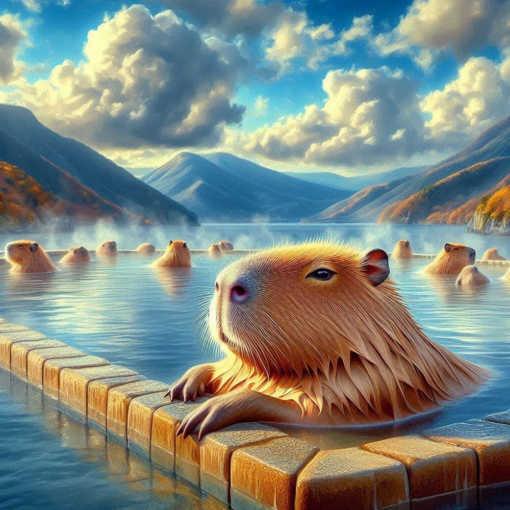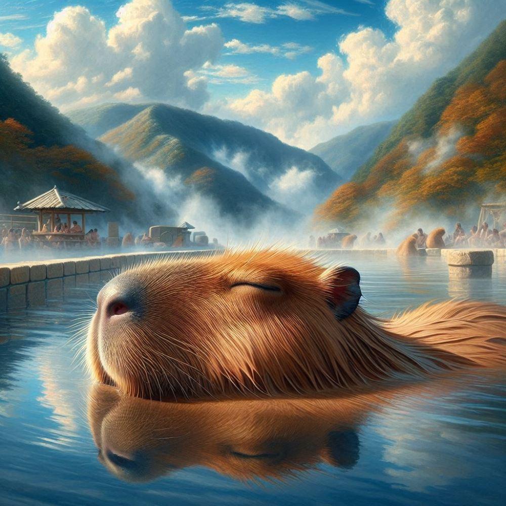油絵、日本一の別府温泉の露天風呂に癒されるカピバラ