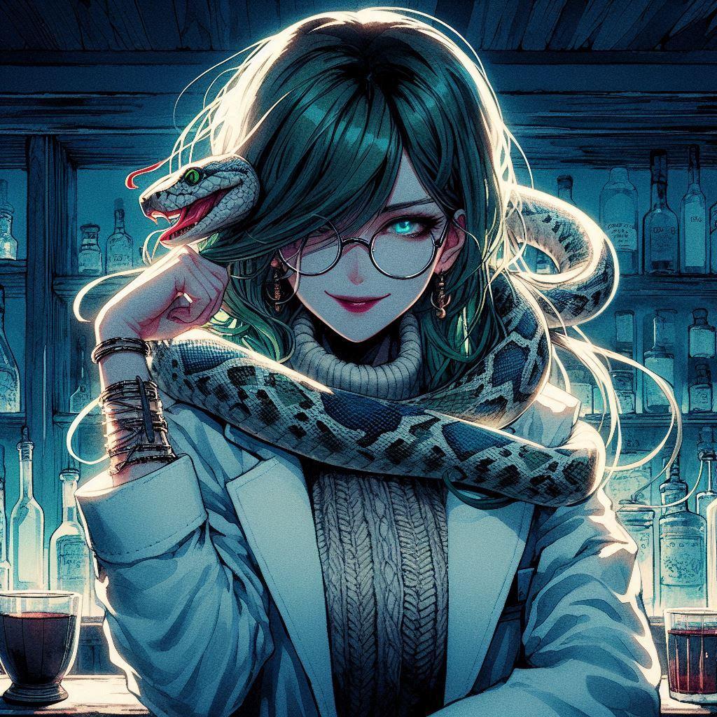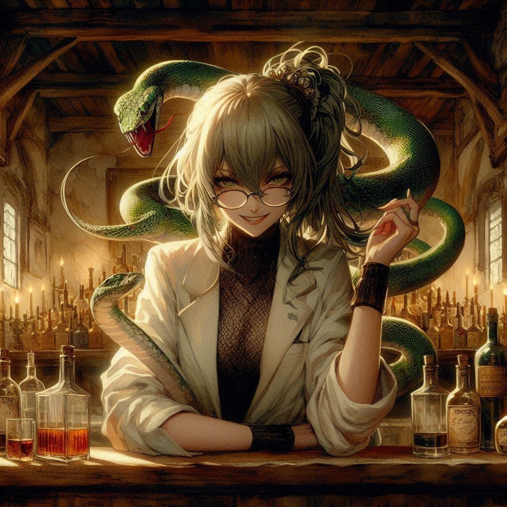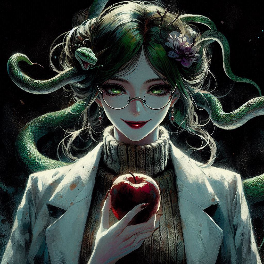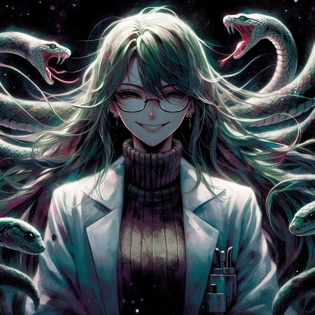 snake hairがDalleで認識率は高くなくて、シンプルな背景に変えたことで要素が減ったのか何枚か生成することができましたε-(´∀`*)ホッ