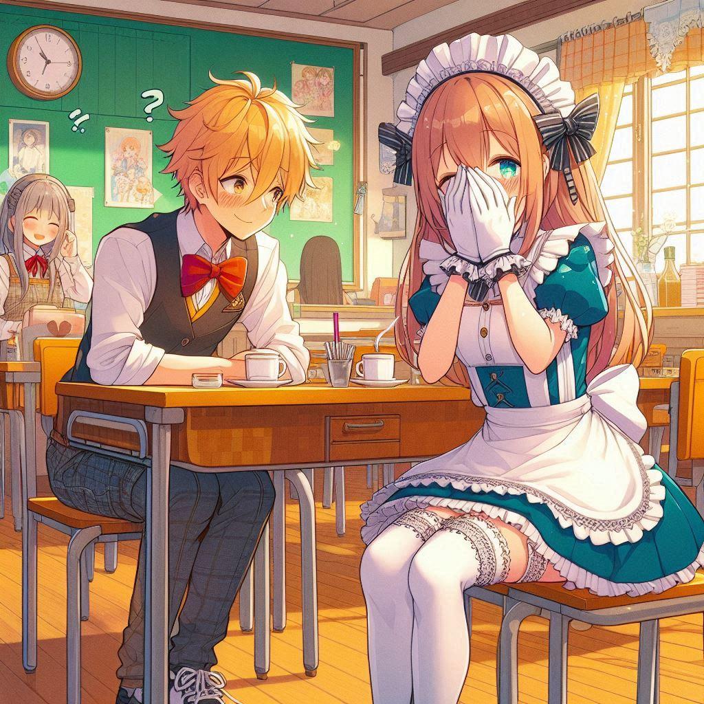 「ここは学園祭名物メイド喫茶なんだろ?サービスしてくれるかい」 「(キャー、なんであの人が来ているの?ちゃんとサービスしなきゃなのに恥ずかしくてできないよー♥)」