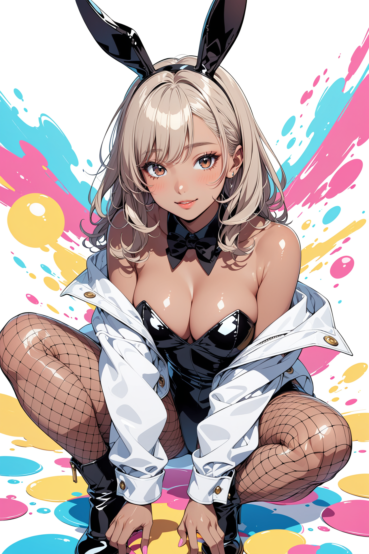 白いジャケットを肩落としに着た、健康的な小麦肌のバニガールさんです。