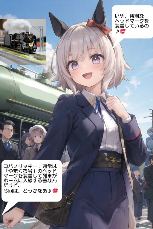 コパノリッキー:まさかね、カレンチャンが一日駅長だなんて…今日はD51蒸気機関車牽引列車の出発式があるから、ワクワクするなあ♪😍