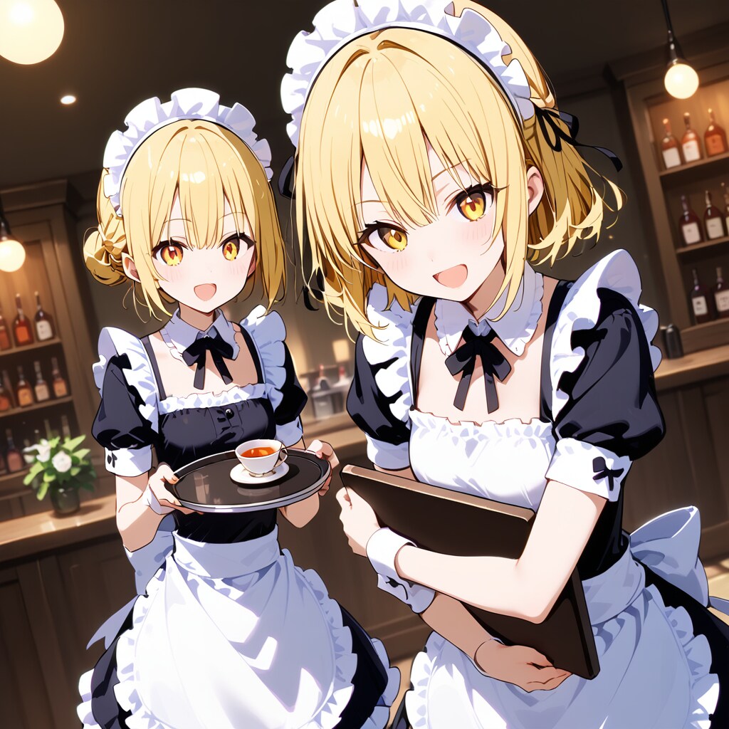 『バーメイド』をもじってバーで働くメイドちゃんを生成しました。AIモデルは指定しなくても勝手にメイドキャップを付けることに定評のあるHALOを使いました。
