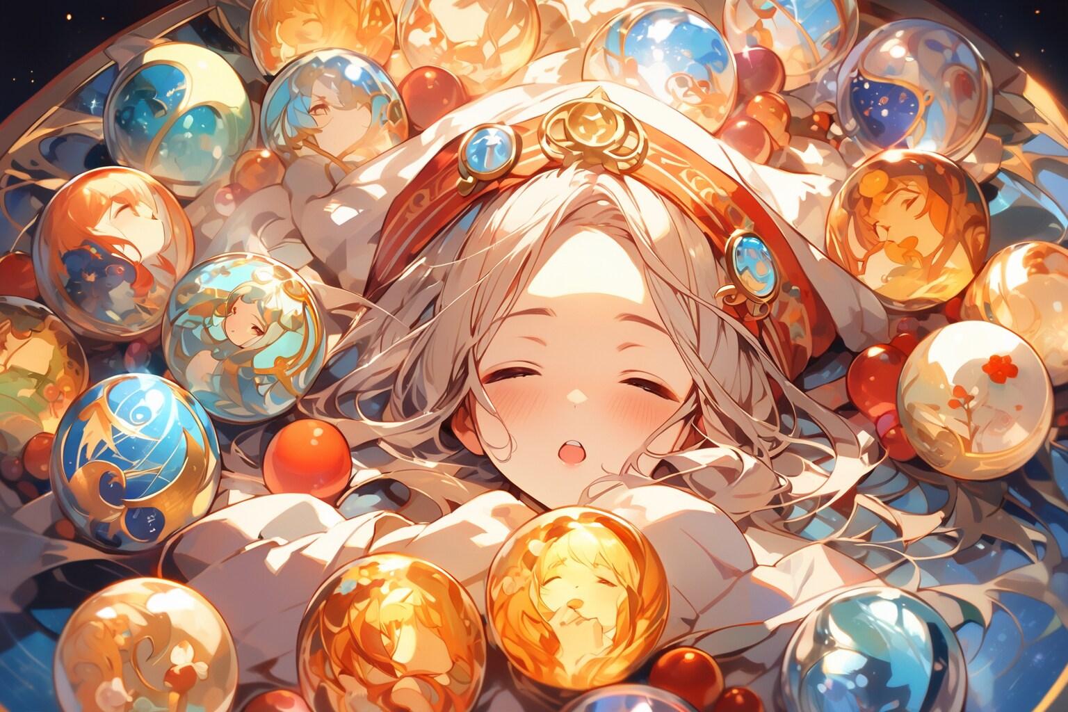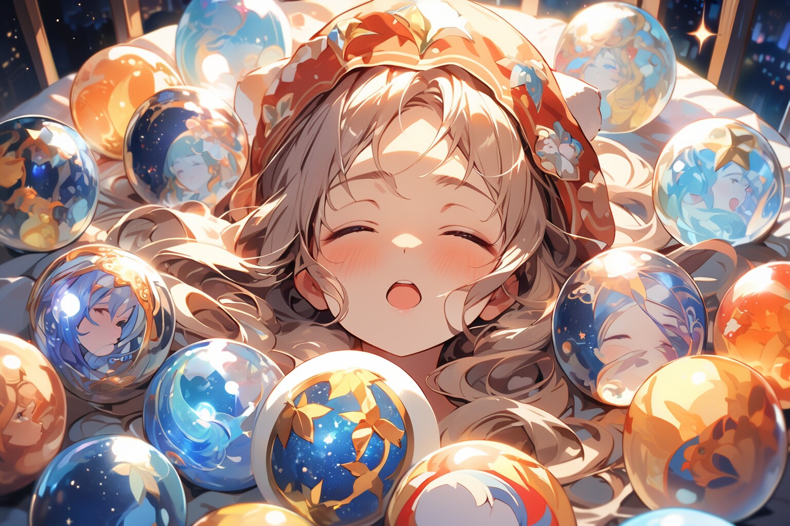 色とりどりの球体が彼女の見る夢1つ1つという風に描けないかなとプロンプトを書いたんですが
