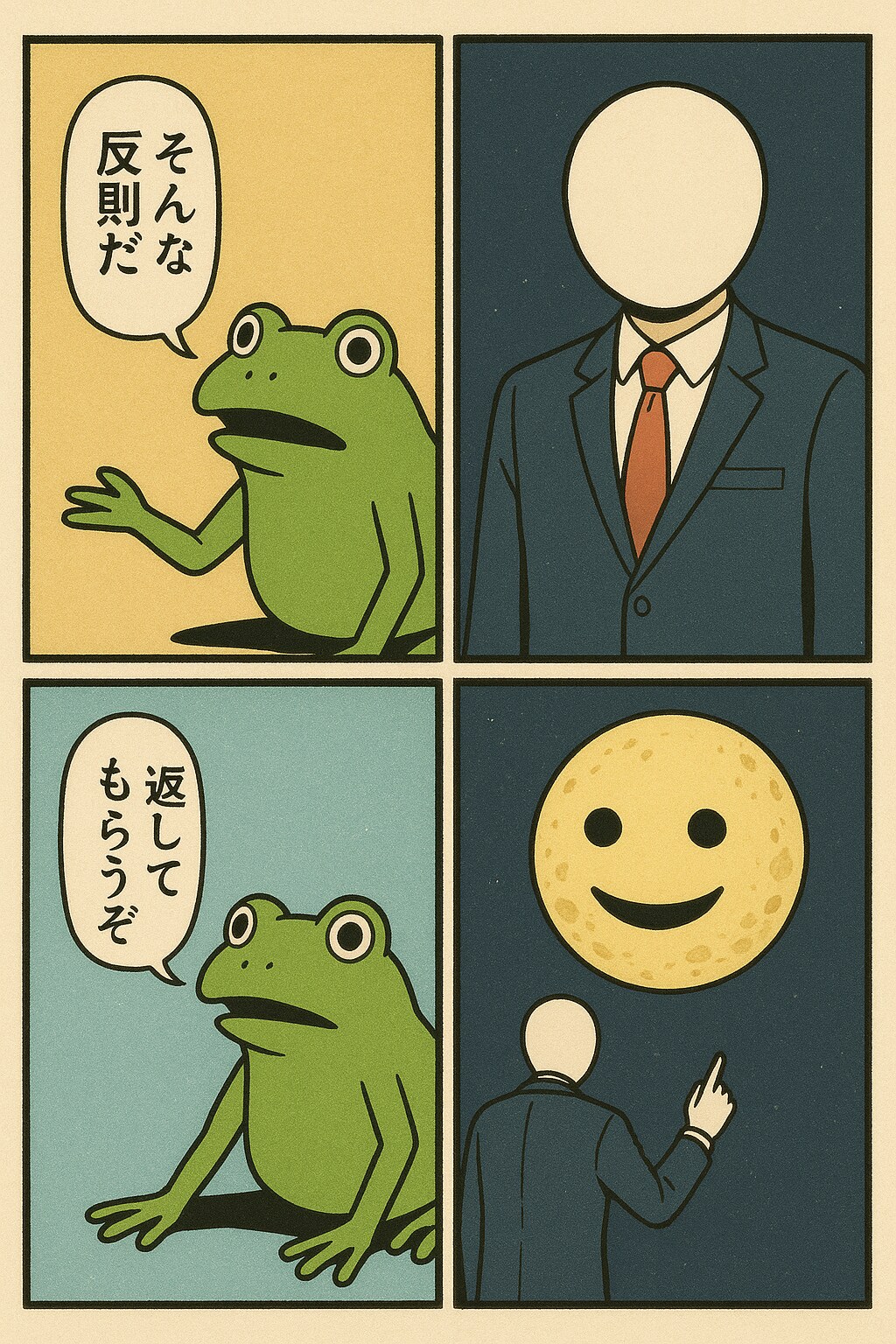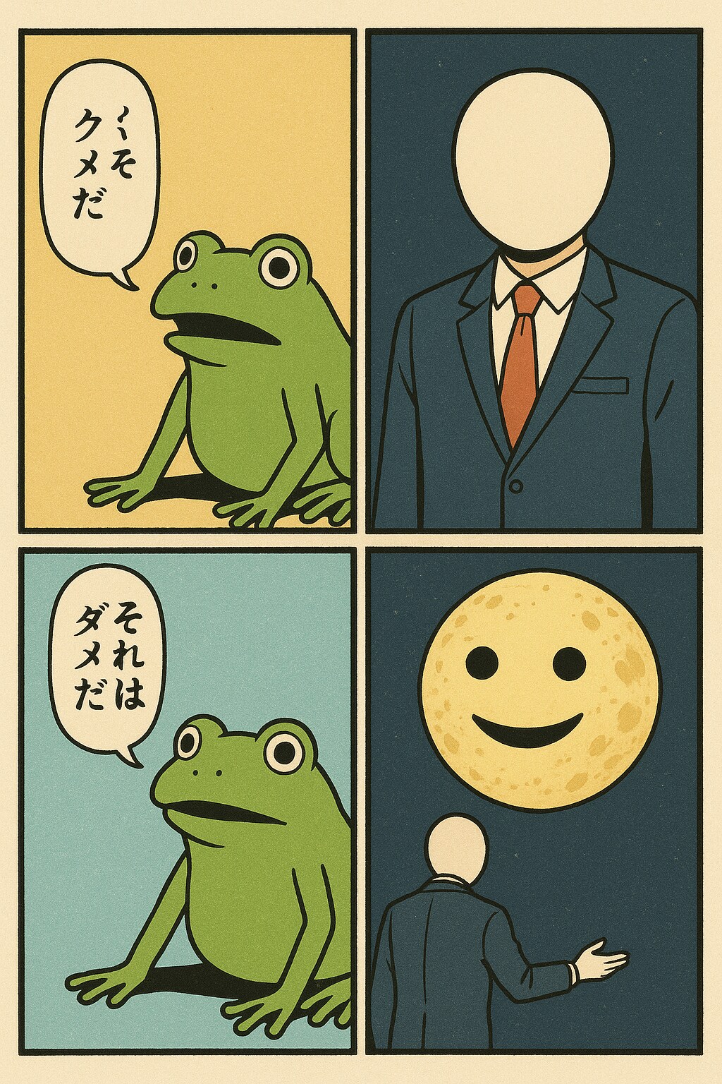 ・そこに「くにへかえるんだな」「カエルの登場」「突然のビジネス感」など、脈絡のないモチーフが重なり、読者に「え、なぜそうなる?」という混乱を与えること自体が目的。