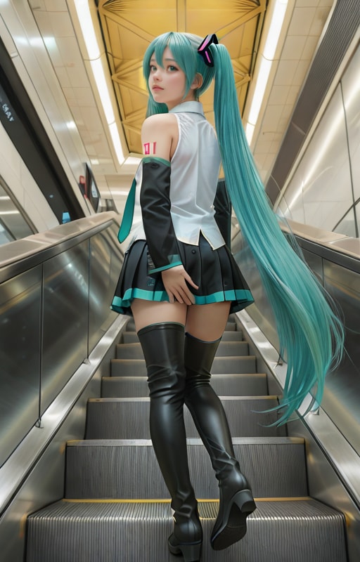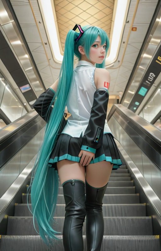 ハロウィン会場に急ぐ初音ミクのコスプレイヤー女子