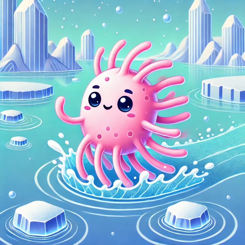 「ももほうくん」が持つ細胞内の不凍成分(グリセリンのような物質)が、その可愛らしい姿とは裏腹に驚くべき耐寒性を発揮していて、氷の海もへっちゃらという設定がとてもユニークです!🍑❄️