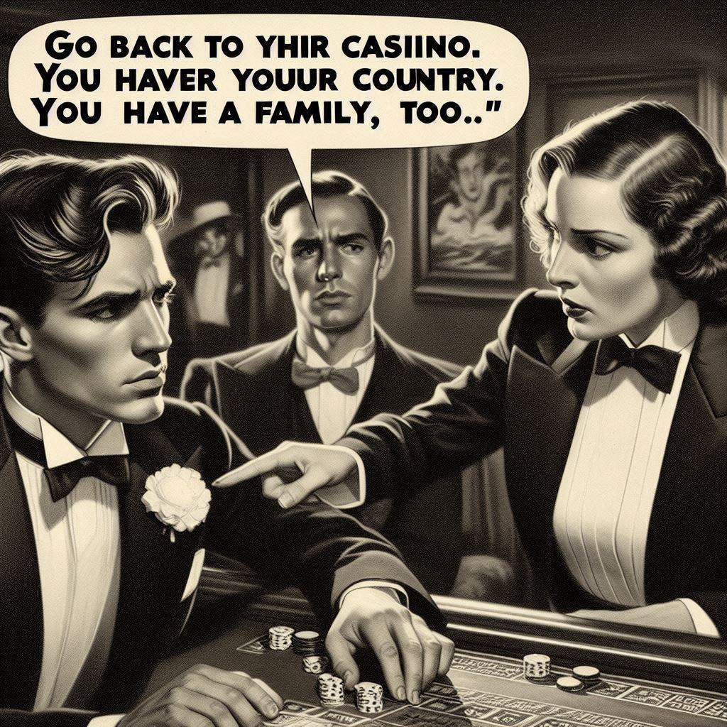 「くにへ かえるんだな おまえにも かぞくが いるだろう…」とポーカーで負けたフー)ドを着て悪(人面の男性に言っている)