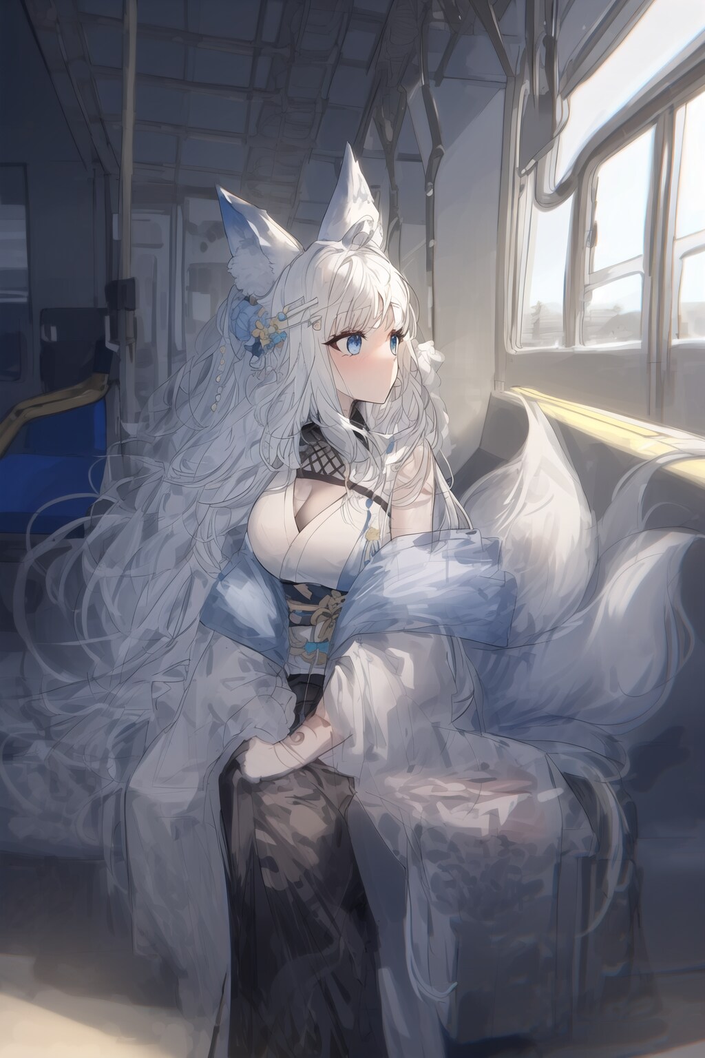 電車内から景色を眺める妖狐さん