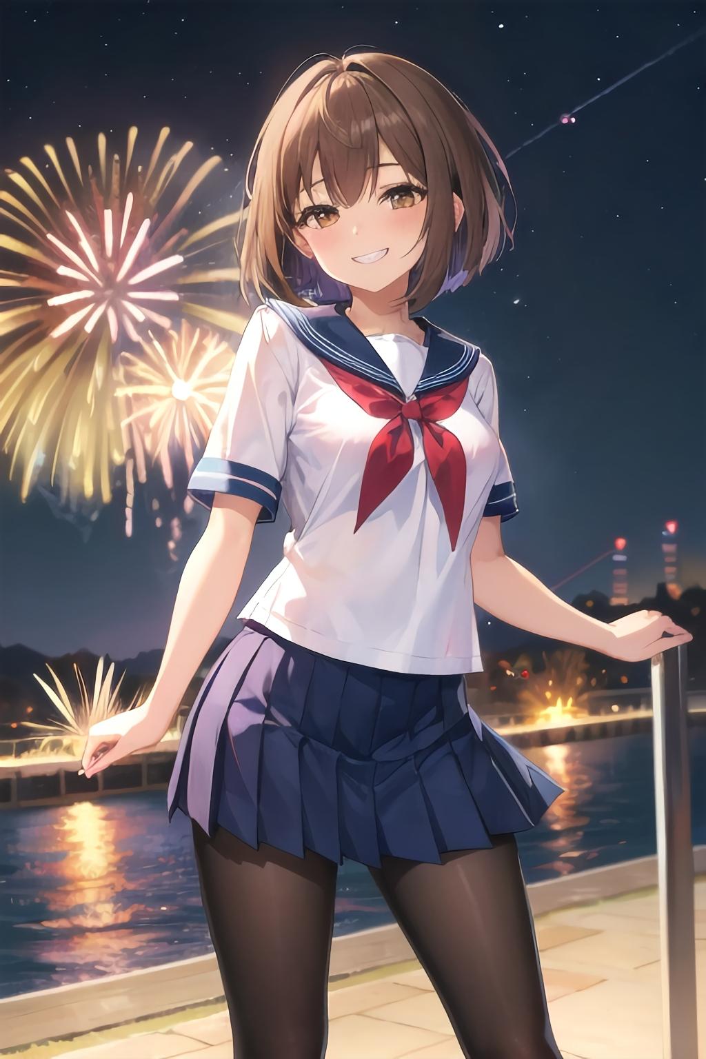 花火をいっしょに見てたら、彼女が笑顔で振り返って、こっちを見つめてくる。そんな激萌えシチュのプロンプトをうちの子(ゆりな)バージョンで生成しました。