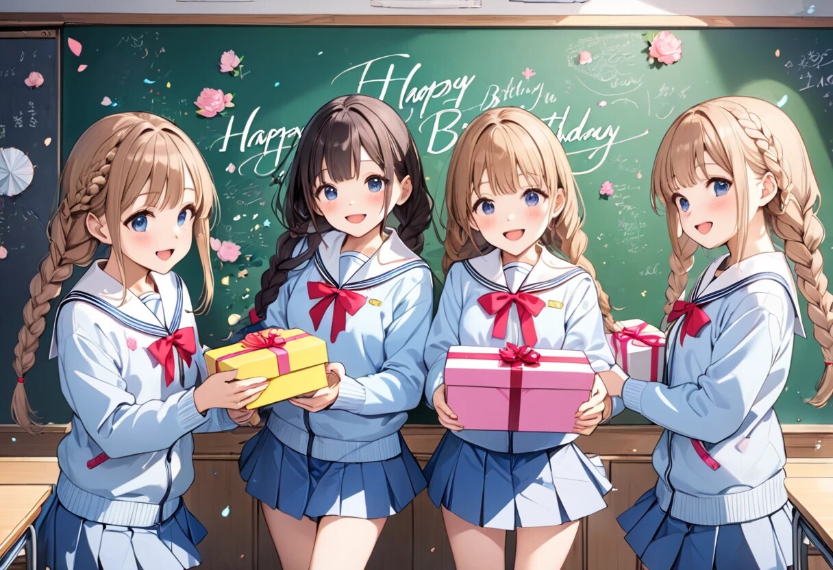 昼休みの後、教室へ戻るとプレゼントに黒板にお祝いのメッセージでデコられていた。