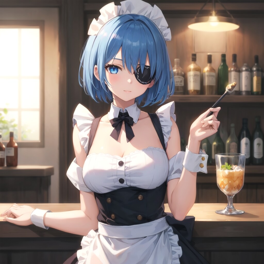 眼帯をつけてバーでカクテルを飲むあいちゃんなのでした。あいちゃんは僕のサークルのマスコットキャラです。