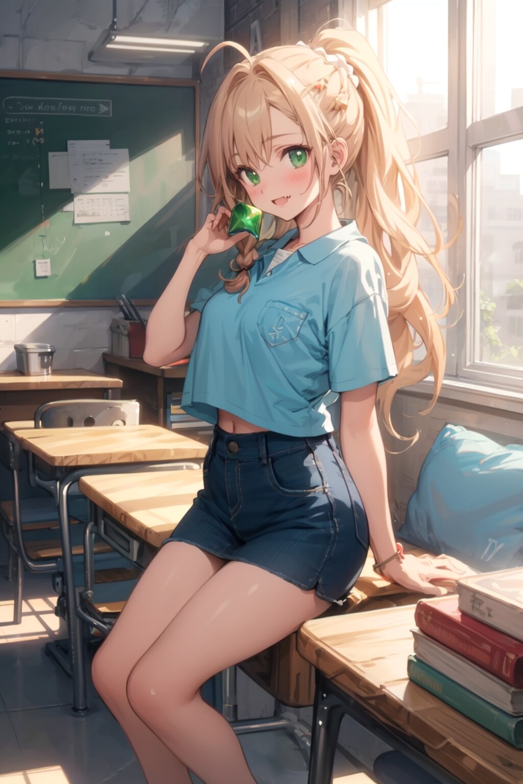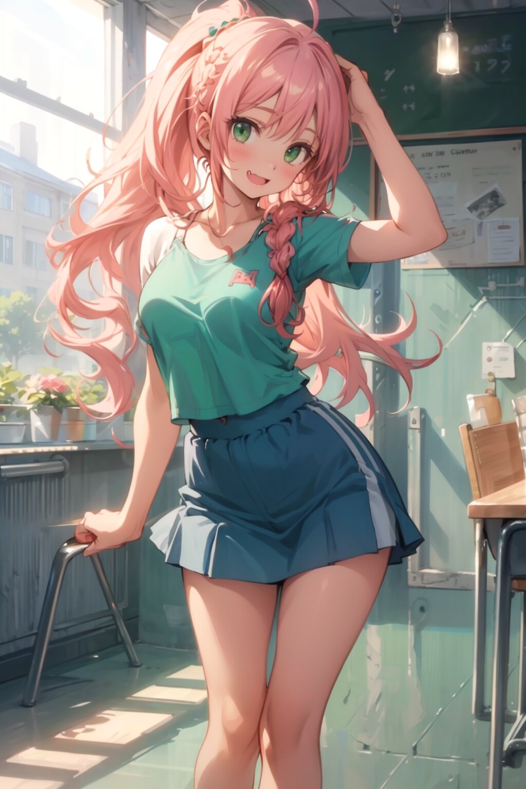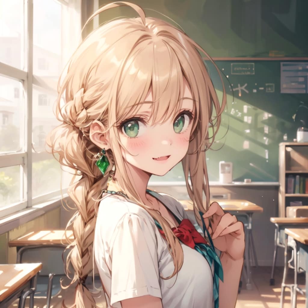 (1 girl is blond-hair Lively second sister of the three sisters), (fang), Female college student, (a cute face, a teasing face), (((blonde hair:1.5))), ((long hair)), bangs, pinned back, ((small ahoge on the top)), (((her braided ponytail is worn up on the left side of her head))), (The Right Sideburn is a Short Braid), (triangular-shaped-Small breasts), (Childish Sisters), (Emeralds Green Eye's), looks like18yo, goddess , braid, ((All about the fashion of a cute sports teacher trainee girl)),