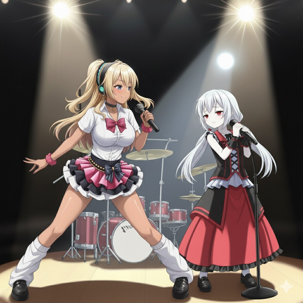 一緒に歌ってもらおうと頑張ったんですが、目の色・身長・髪色などがうまく一致せずに、最後の二枚はGeminiで合成しました。